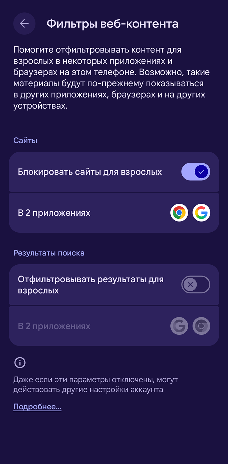 - Фильтрация содержимого магазина приложений, веб-сайтов и результатов поиска.