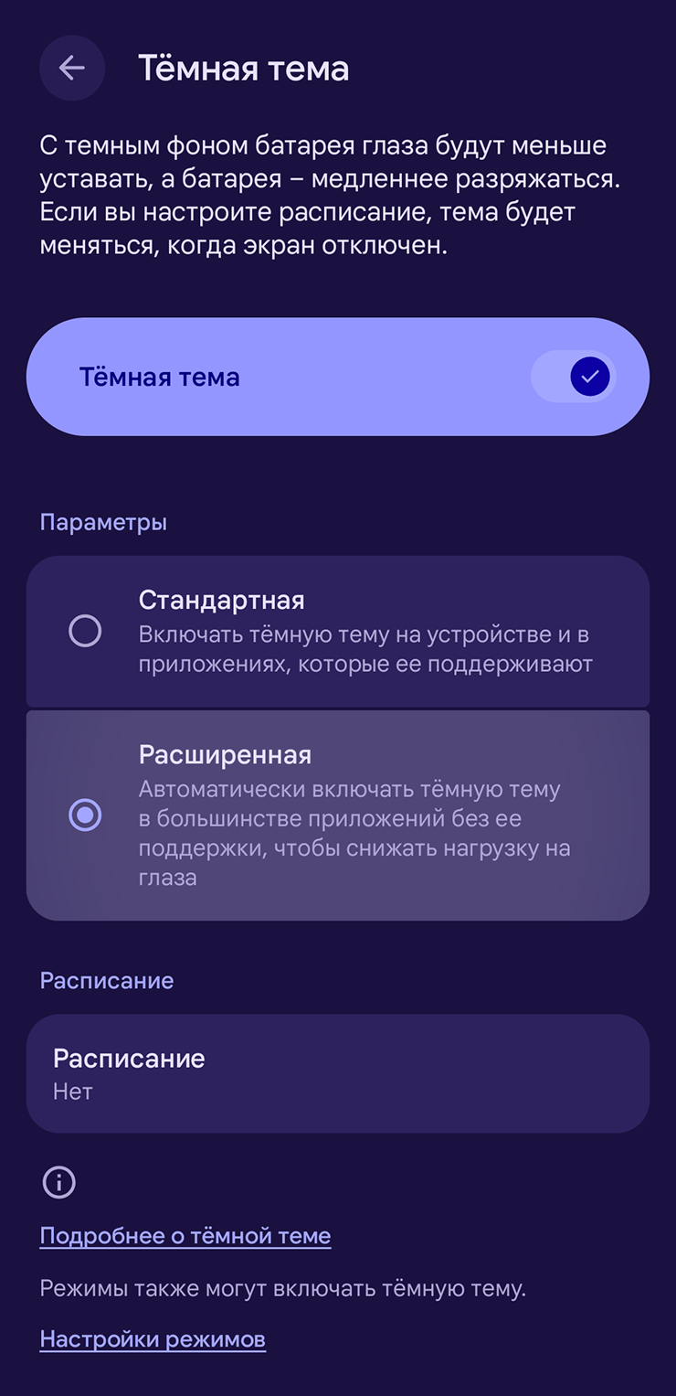 Принудительная темная тема для приложений. Функция называется «Расширенная темная тема» — она меняет цветовую схему приложений, разработчики которых не позаботились о ночном режиме.