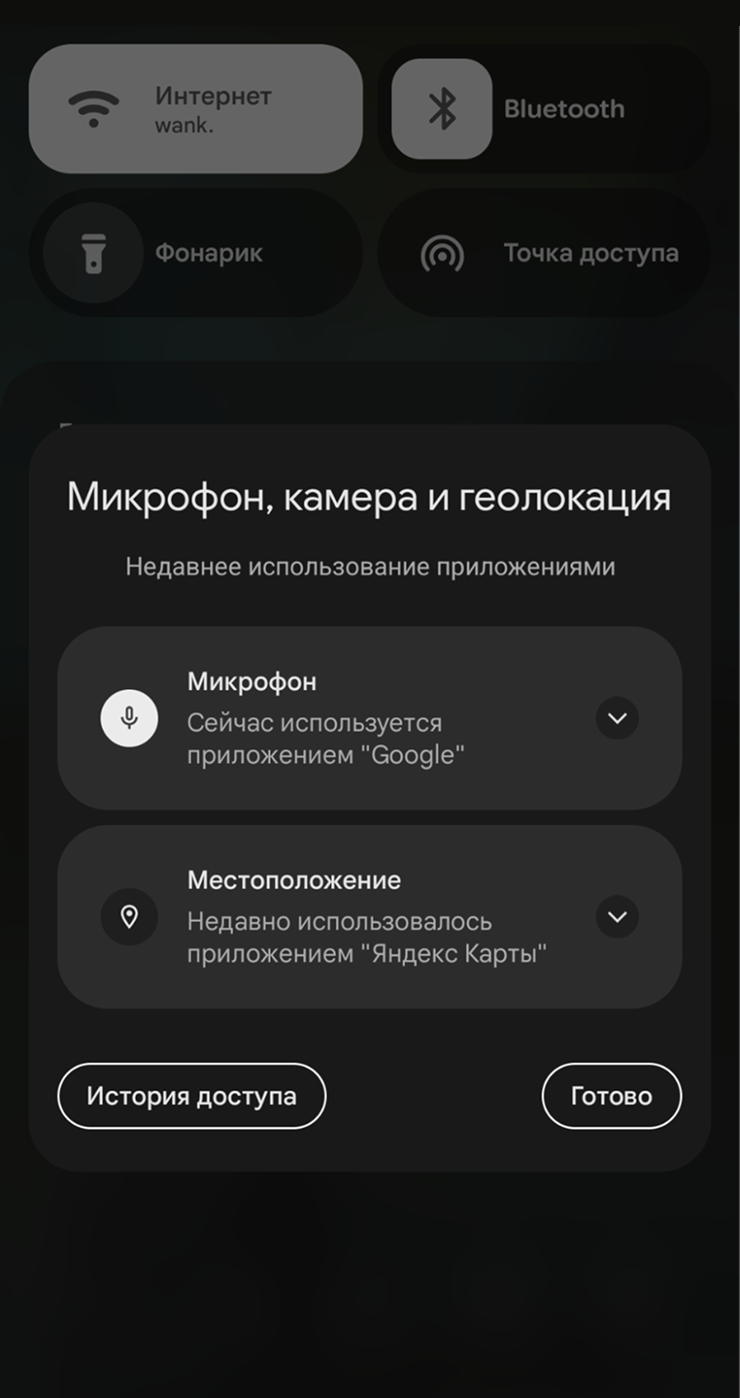Как отследить использование разрешений. Когда приложение использует микрофон, камеру или геолокацию, смартфон показывает в строке состояния сверху небольшой индикатор. Нажав на него, можно увидеть, какое именно приложение сейчас обращается к этим данным.
