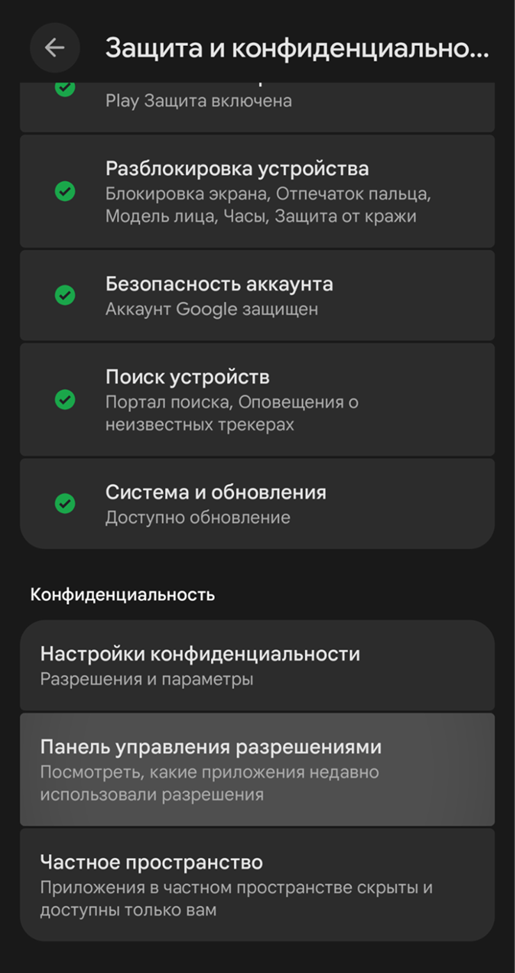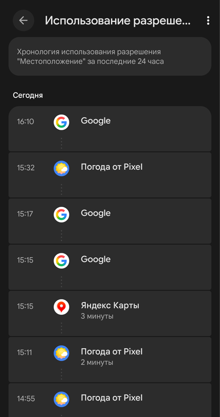 Кроме того, в Android есть панель управления разрешениями. Обычно она находится в разделе «Настройки» → «Защита и конфиденциальность». Здесь отображается, какие разрешения использовались за последние 24 часа или семь дней. Если нажать на конкретное разрешение, откроется хронология, какое приложение и когда получало к нему доступ.