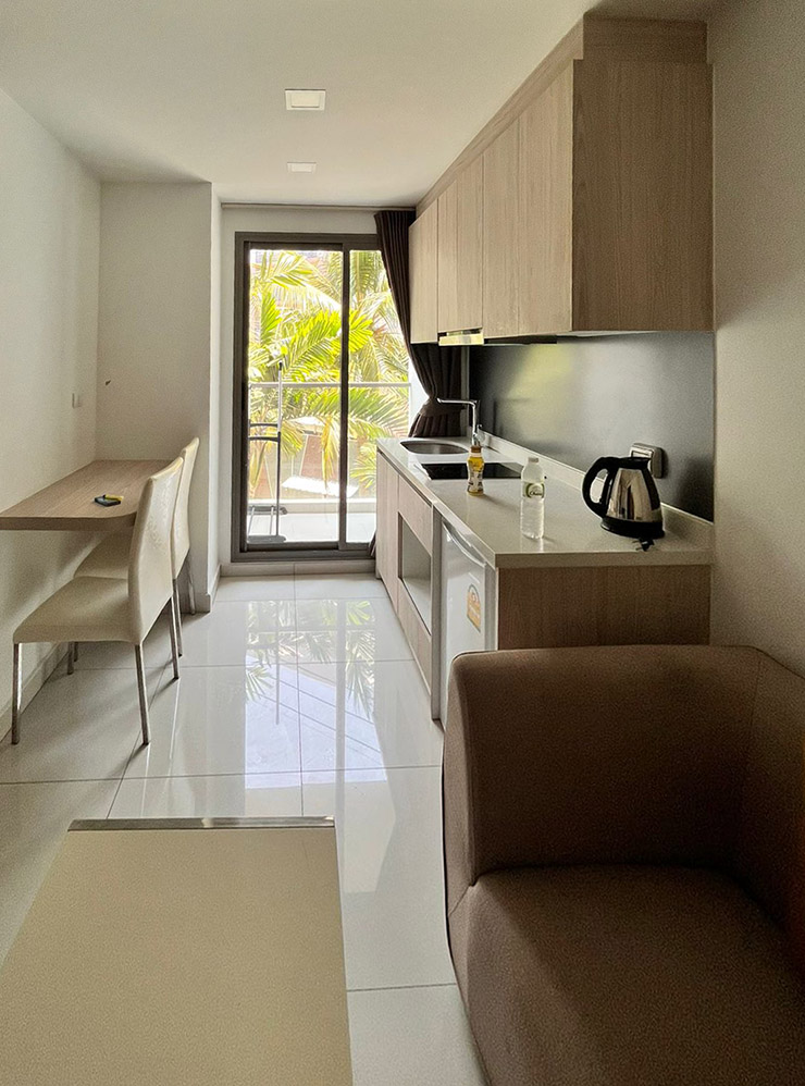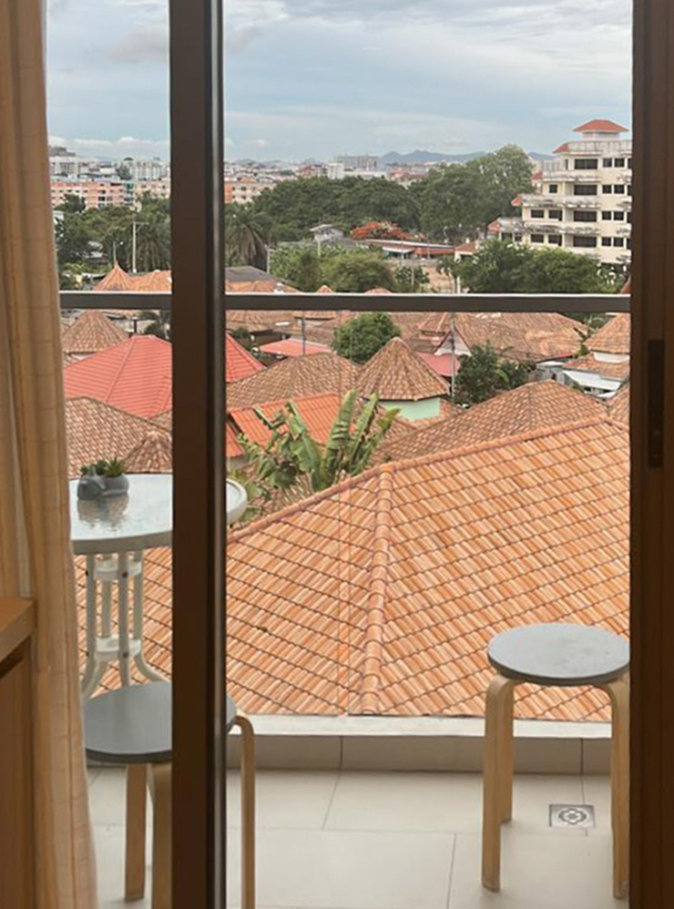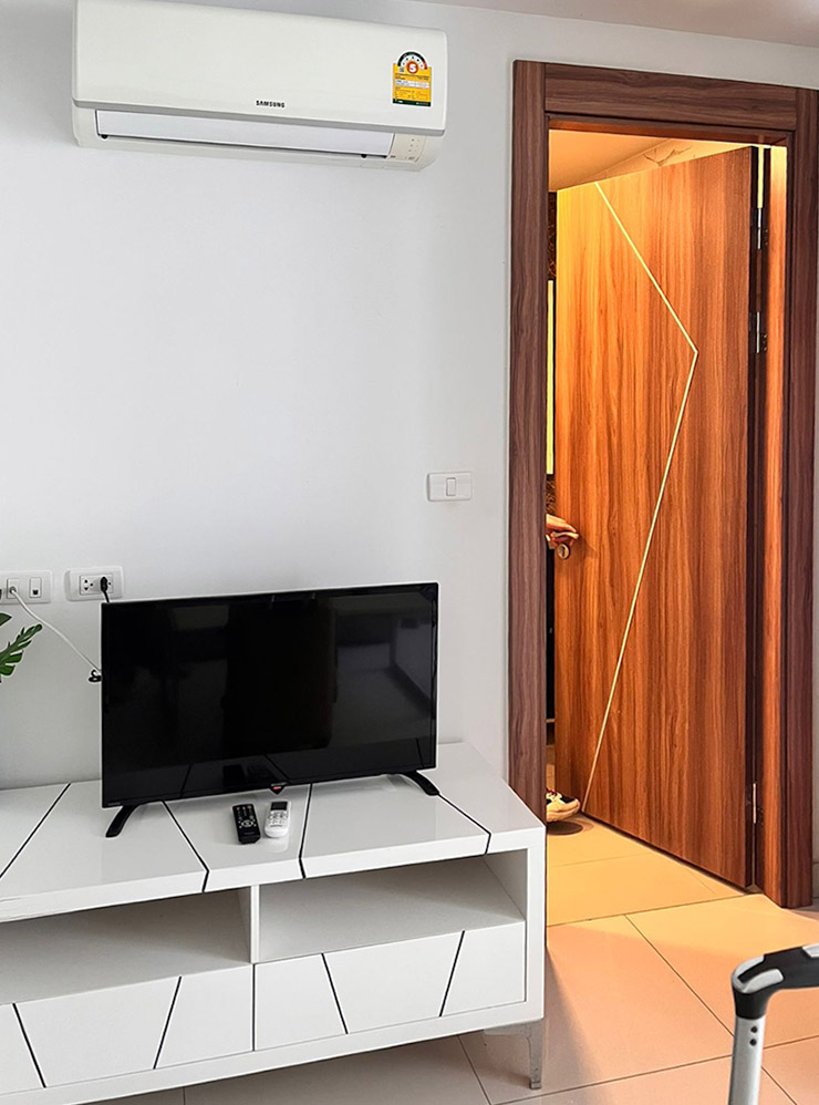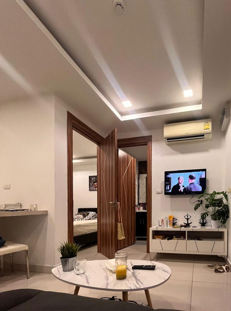 Я жила в классной квартире 25 м² в комплексе Grene Condo. Это называлось студией, но на деле там отдельная кухня, небольшая гостиная при входе и спальная комната, которая отгораживалась стеклянной перегородкой со слайд-дверью. Все это выглядело как однокомнатная квартира, и меня впечатлило грамотное зонирование.