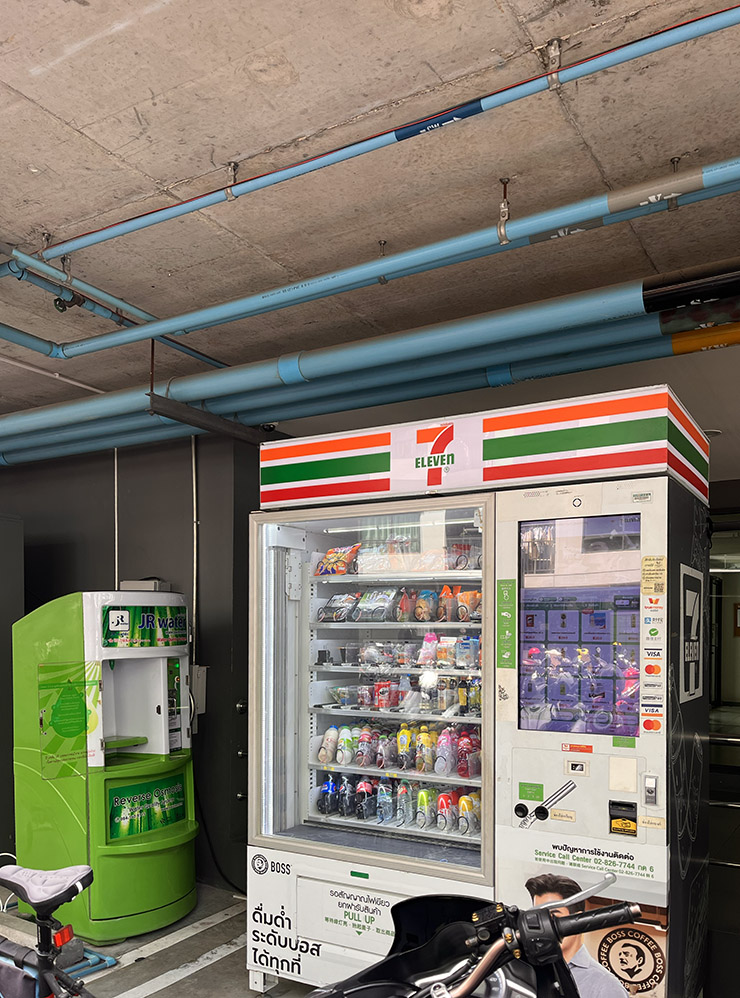 Также возле здания стояли автоматы от моего любимого магазина 7-Eleven, где я часто покупала цезарь с курицей и другие готовые блюда. Рядом стояла микроволновка, которой я тоже пользовалась. Там же располагалась машина для набора воды и автоматы с кофе и молочным чаем.