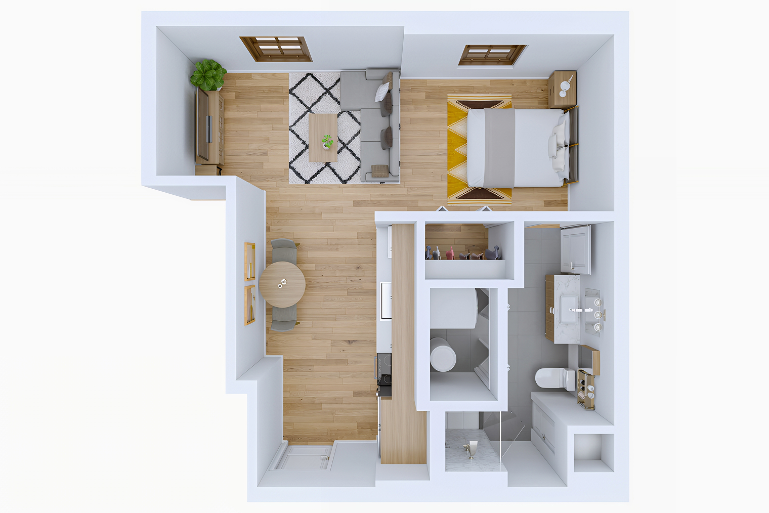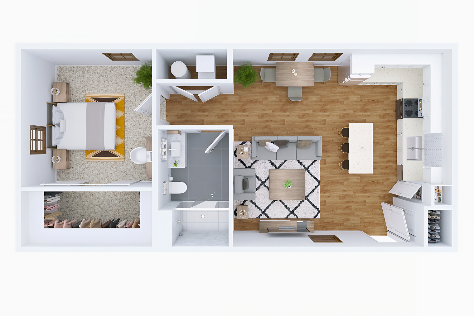 В отличие от России, в США количество комнат рассчитывается по спальням. Студия — это когда кухня, спальня и гостиная находятся в одной комнате. Если есть кухня-гостиная и спальня, такой объект считается однокомнатным (1-bedroom), если две отдельные спальни — двухкомнатным (2-bedroom) и так далее.