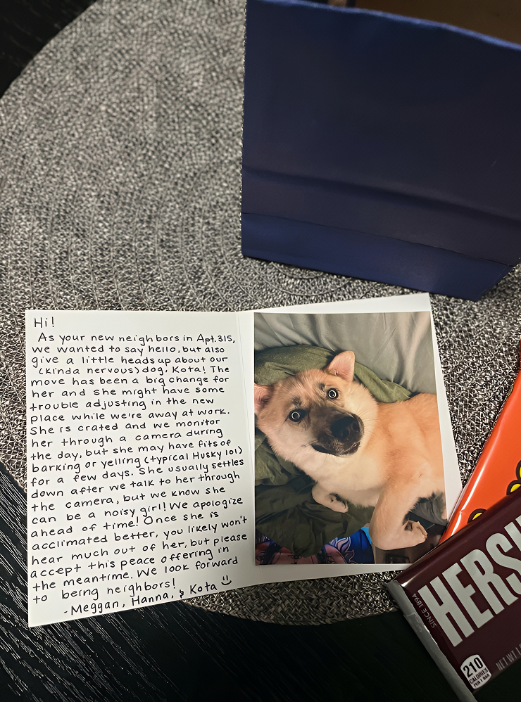 Второй — предупреждать о неудобствах заранее. Однажды утром я обнаружила на пороге квартиры подарочек: крафтовый пакет с запахом какао-бобов. Внутри была записка с фотографией собаки — хаски по имени Кота. Авторы послания с трогательной заботой предупреждали о возможных вокальных импровизациях питомца во время их отсутствия. Еще там лежали шоколадки в качестве извинения.