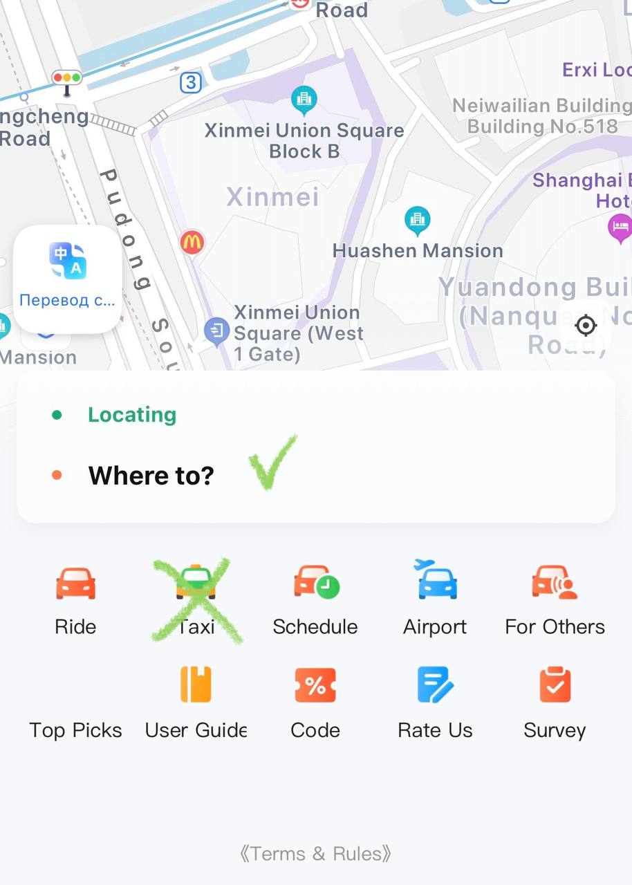 Приложение и поиск в нем на китайском языке, но в целом все интуитивно понятно ̶ есть точка отправления, есть точка прибытия.