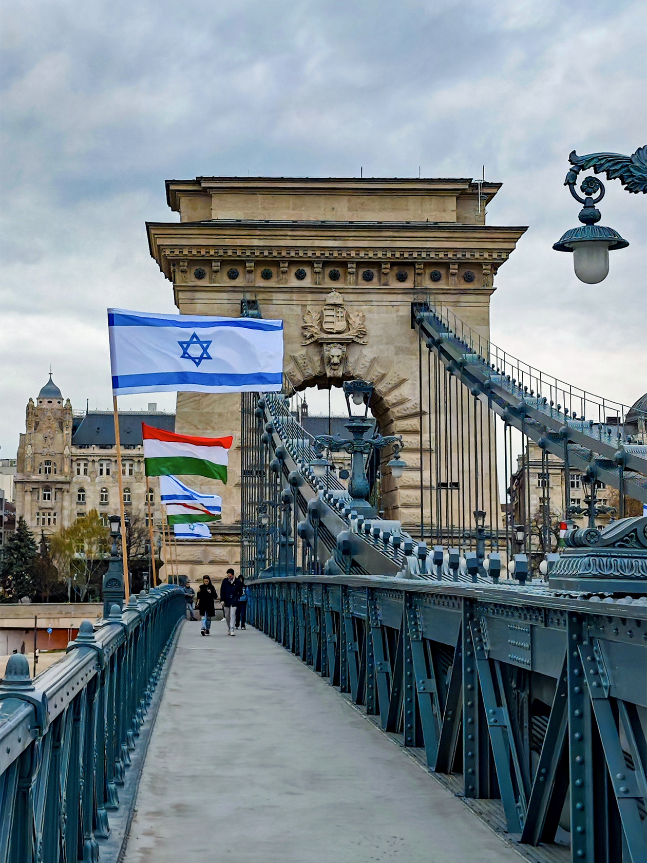 В Будапеште моросил дождь и дул ветер. Около Рыбацкого бастиона было безлюдно по сравнению с предыдущим днем, и я смогла сделать хорошие фото. Мы спустились вниз и перешли по цепному мосту Сечени в район Пешт. В этот день в город прилетел израильский премьер-министр Биньямин Нетаньяху, поэтому весь мост оказался утыкан флагами Венгрии и Израиля.