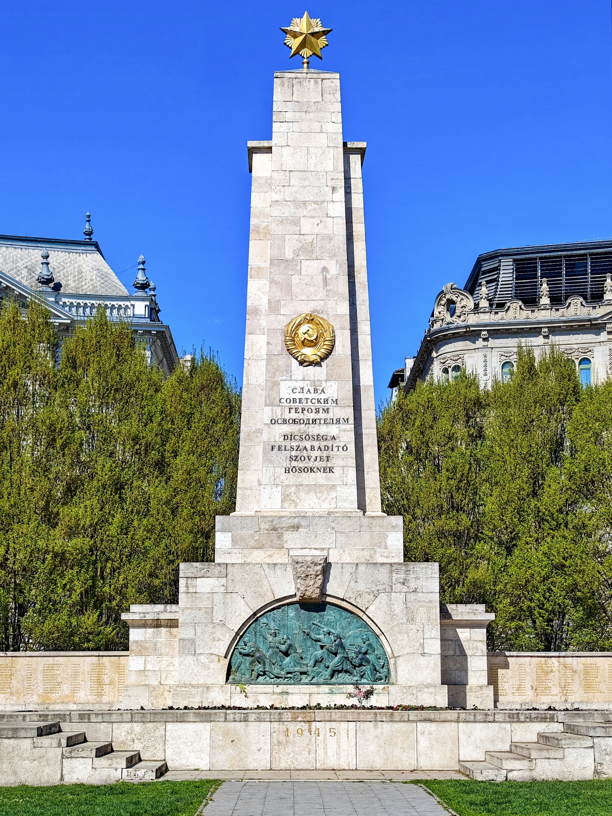 Памятник советским солдатам на площади Свободы — простой обелиск со звездой и надписью, без лишних деталей. Вокруг него — ухоженные клумбы и скамейки. Когда мы пришли, рабочие тщательно убирали территорию, прилегающую к памятнику. Ощущалось, что это не просто туристическая достопримечательность, а часть исторической памяти.