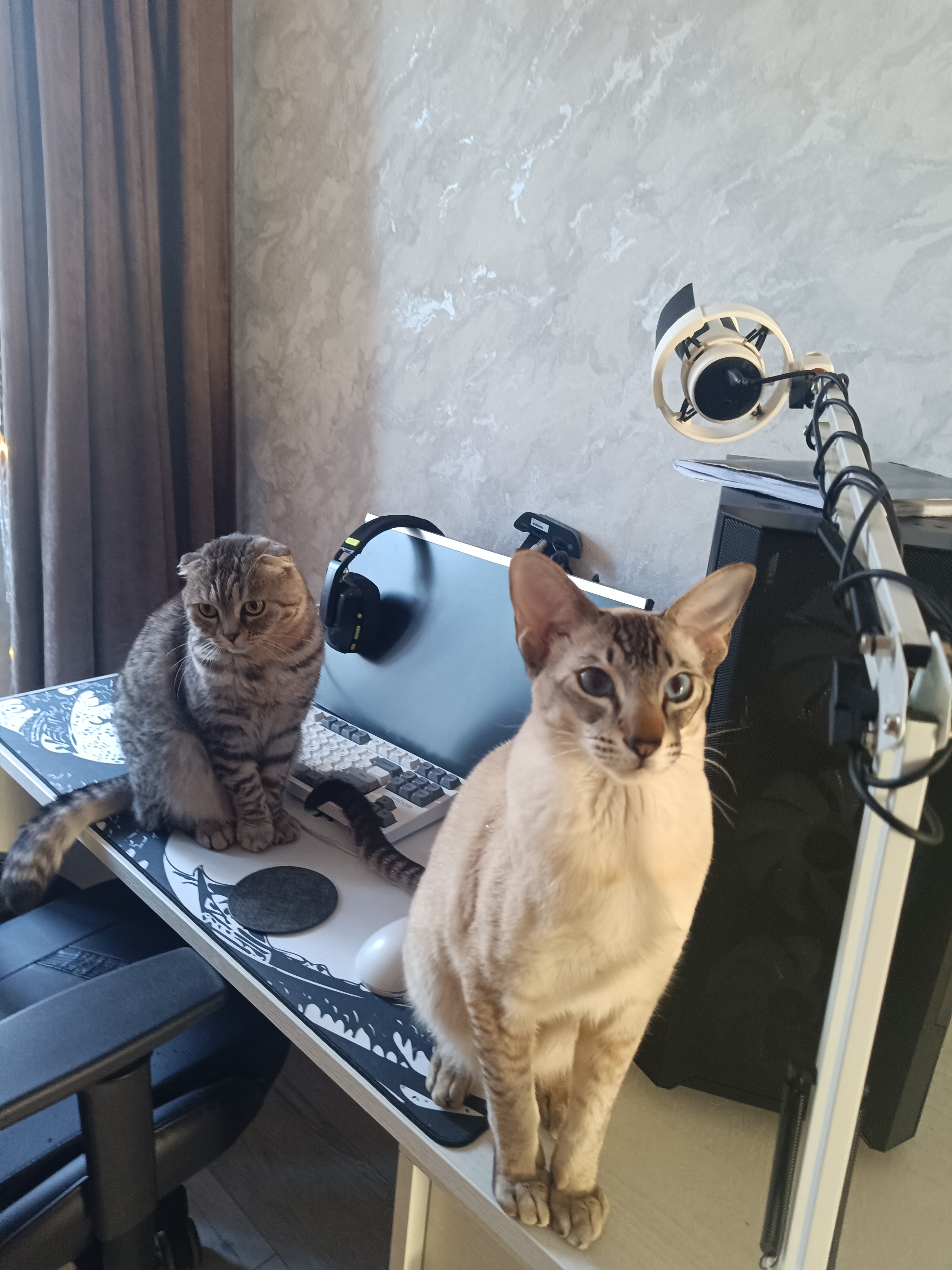 Фото питомцев: кошка Ася и кот Зефир сидят на столе, пока хозяин на учебе