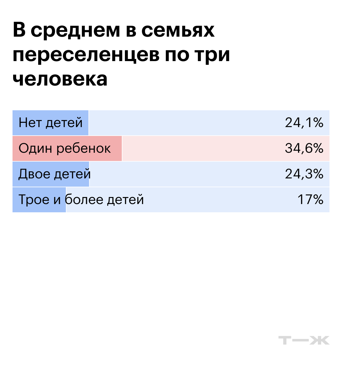 Мужчин и женщин почти поровну: 56 и 44% соответственно. При этом нужно учитывать, что семьи переезжают все вместе, хотя заявителем выступает кто-то один. По данным ЦАМ, среднестатистическая семья состоит из трех человек . При этом каждый пятый заявитель не имеет семьи — это холостые, разведенные и вдовцы (более 19%). Почти четверть переселенцев не имеют детей — 24%.