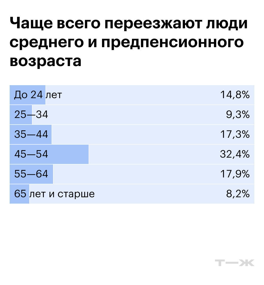 Типичному участнику программы переселения от 45 до 54 лет — это почти треть заявителей, с которыми работает ЦАМ , или 32%. Значительная доля переселенцев — люди предпенсионного и пенсионного возраста. Среди заявителей 18% в возрасте 55—64 года, еще 8% — от 65 до 75 лет.