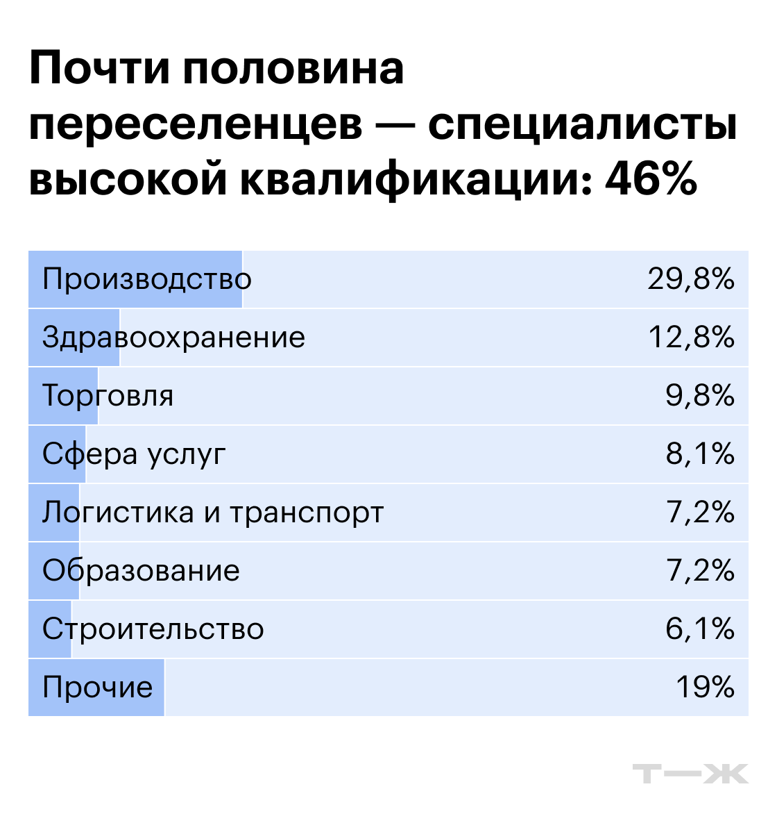 Большинство переселенцев получили высшее образование — почти 49% . А среди тех, кто указал профессиональную сферу деятельности, 46% — специалисты высокой квалификации, в том числе 1,5% — «особо ценные специалисты», которые участвовали в разработке стратегически значимых для России технологий. Еще 9% — предприниматели, 14% — представители рабочих профессий .