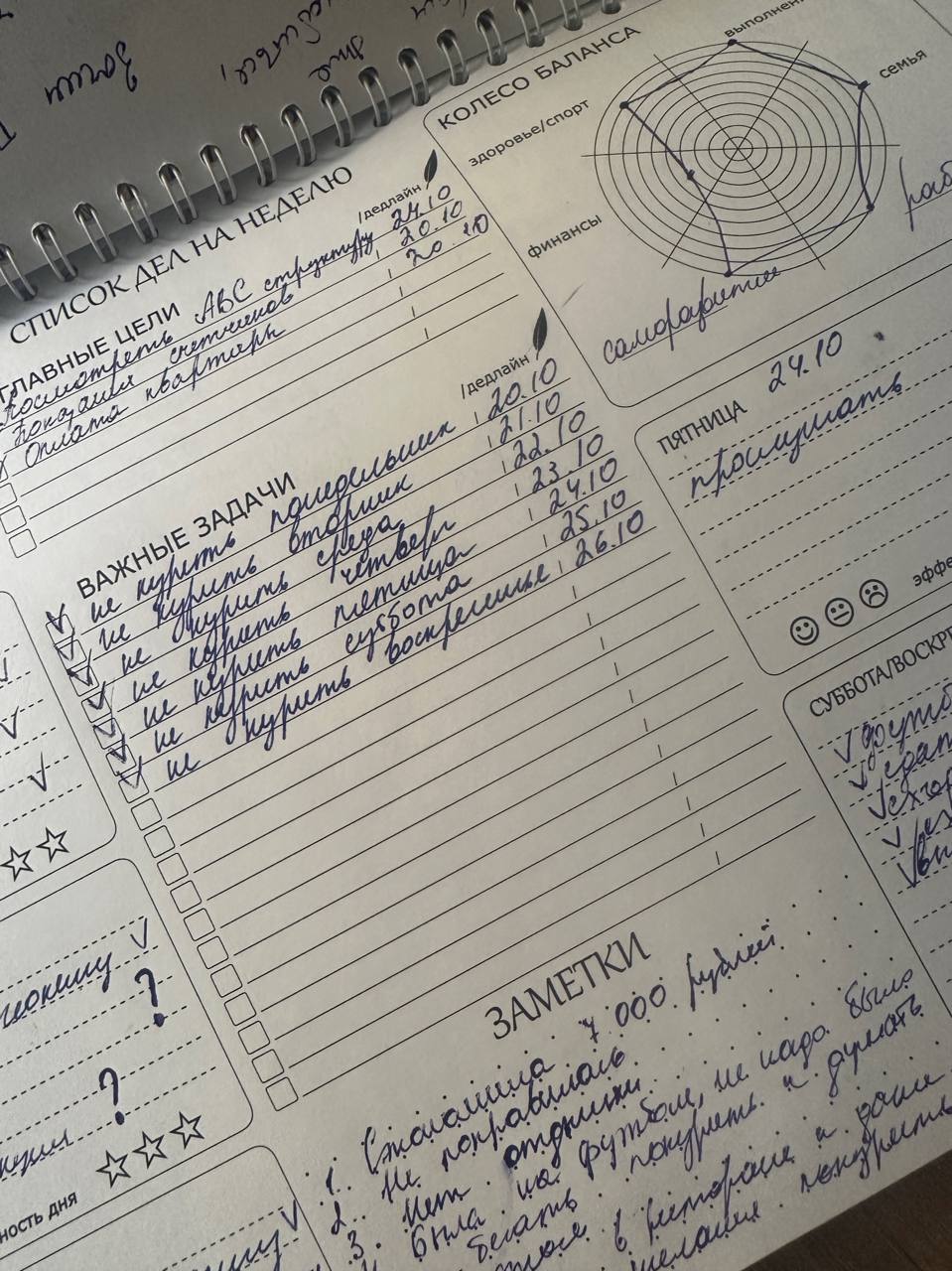 - Планировщик на неделю, я слушаю аудиокниги и хожу гулять, вместо кровати с гло в обнимку. Отмечаю галочками какждый победный день — без сигарет. Каждый день я выписывала плюсы отказа, это очень помогает и не дает попасться в ловушку снова.