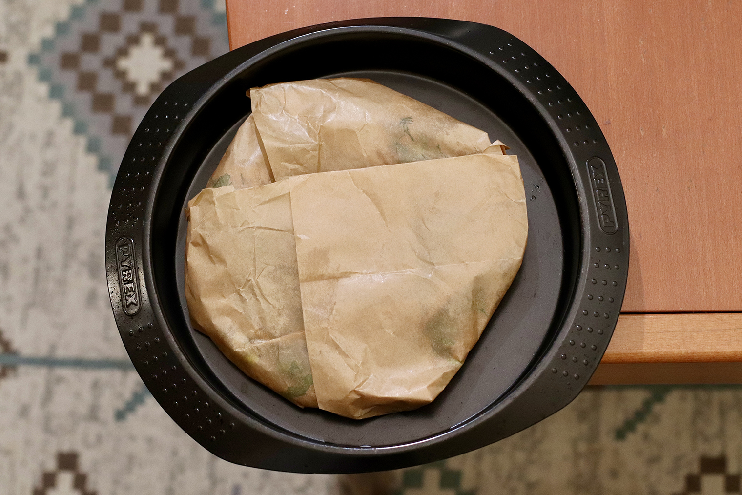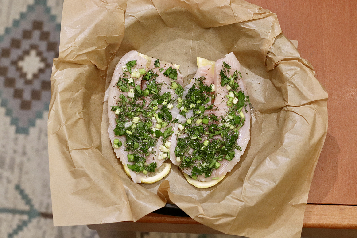 Шаг 4. Масло с зеленью равномерно распределите по рыбе. Накройте краями бумаги для выпечки и прижмите конверт. Плотно запечатывать не обязательно
