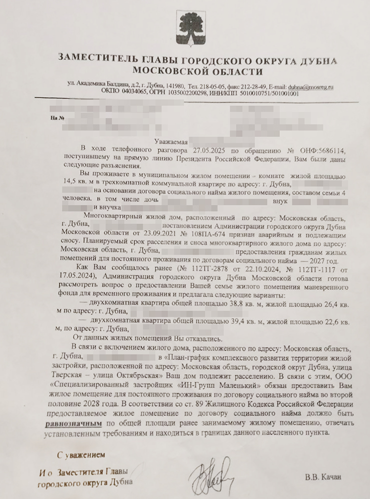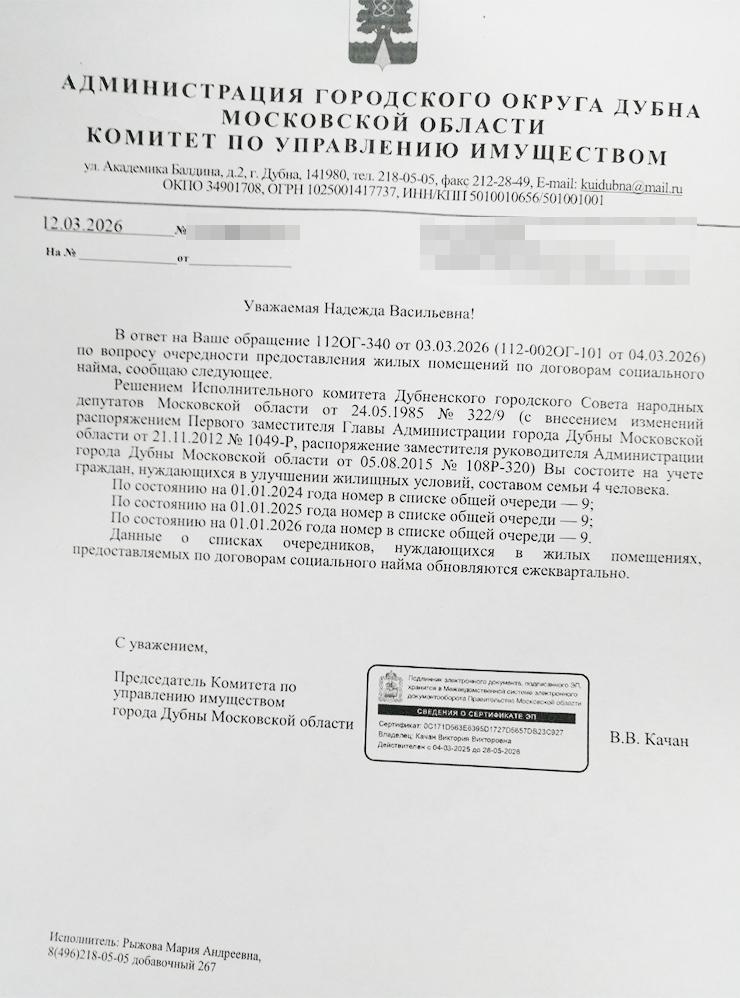 В марте 2026 года Надежда Васильевна подала заявление главе городского округа Дубна с просьбой предоставить ей жилье по соцнормам вне очереди, так как дом был признан аварийным — но вновь получила формальный ответ. Семья обратилась в прокуратуру и готова идти в суд — в аналогичных ситуациях он иногда встает на сторону жильцов .