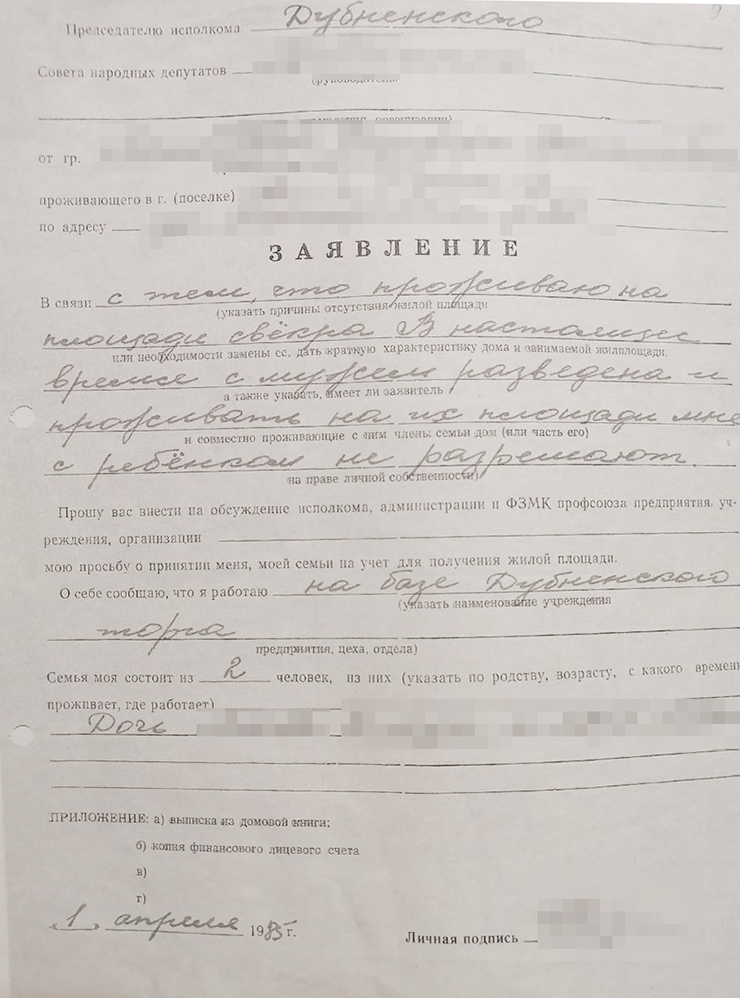 «Мама пришла со мной маленькой, а ей заявляют: „Мы на обед“. Она и говорит: „Люба, ты подожди, тетя пообедает, а ты пока без дома побудь“. Усовестились, организовали собрание и выделили нам комнату в муниципальном фонде», — вспоминает Любовь.