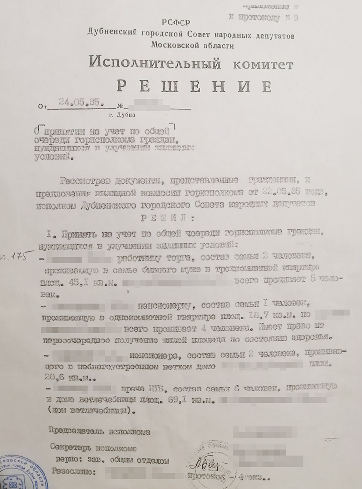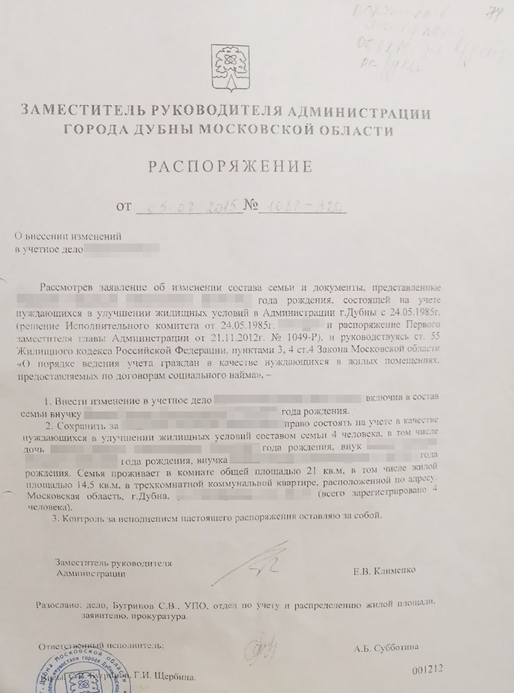В администрации женщинам объясняют: 40 лет назад Надежда Васильевна с дочкой получили одну комнату — а значит, при расселении аварийного жилья им положена соразмерная площадь. При этом игнорируют, что у семьи есть и другое основание для получения жилья — очередь. По нему каждому из членов семьи положено не менее соцнормы, которая в Дубне составляет 14 м² — то есть от 56 м² на всех.