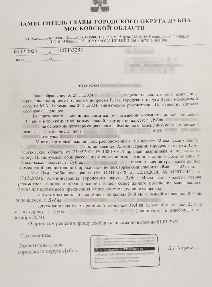 Позже прислали и бумагу, где сообщили, что дом попал под программу КРТ и будет расселен, и — во второй половине 2028 года им выделят новое жилье равнозначной площади по договору соцнайма. Вот только по нему семья проживает в одной комнате, а не в трех. То же самое семье сказали и на последнем собрании жильцов: при расселении жилья учтут только прописку в одной комнате, а остальные две — нет.