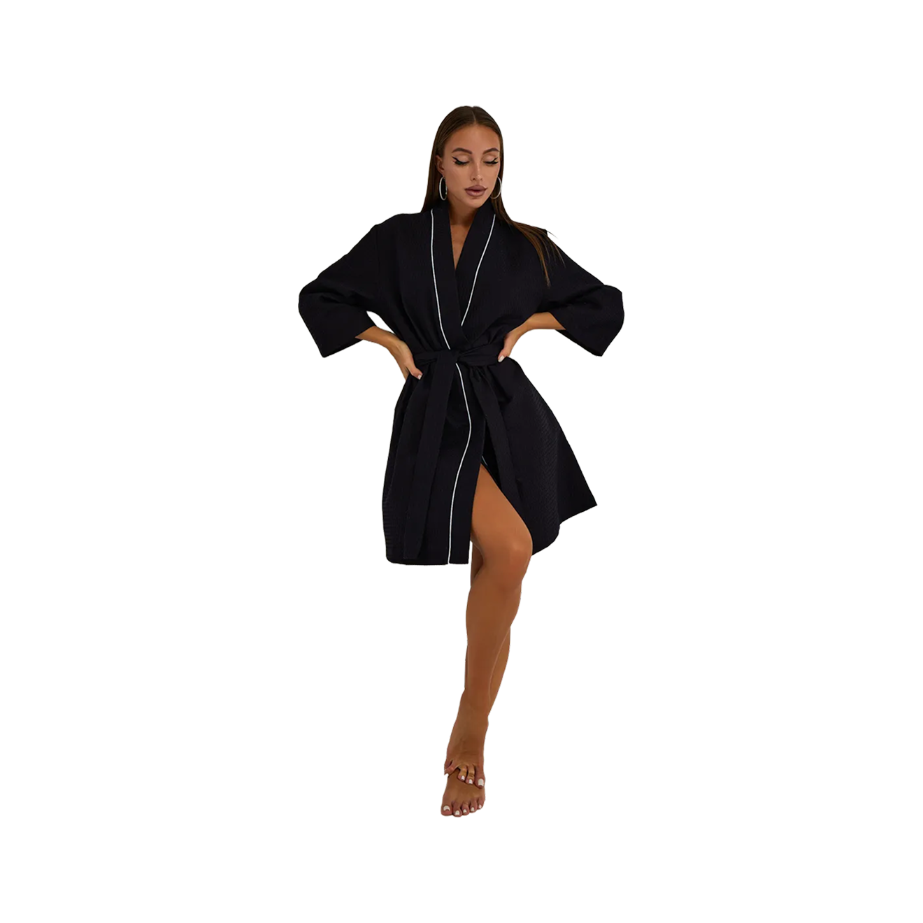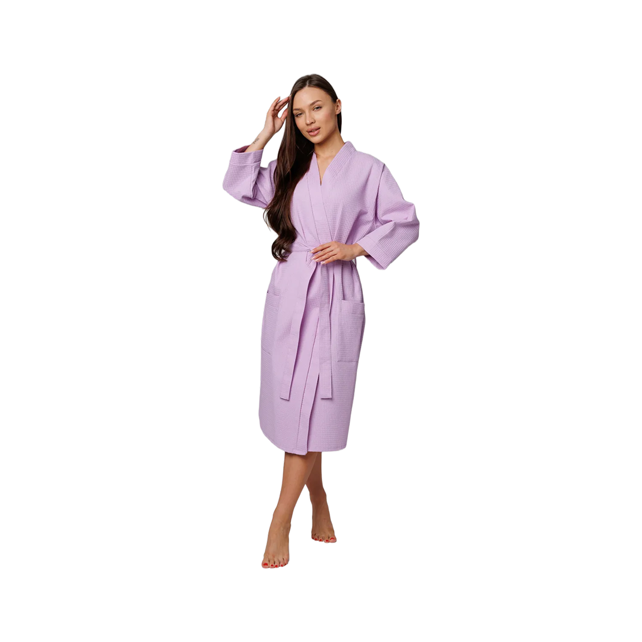 Вафельные халаты можно узнать по характерному геометрическому узору. Их любят за хорошую впитываемость и невесомость материала, который высыхает быстрее махры и куда более компактен.