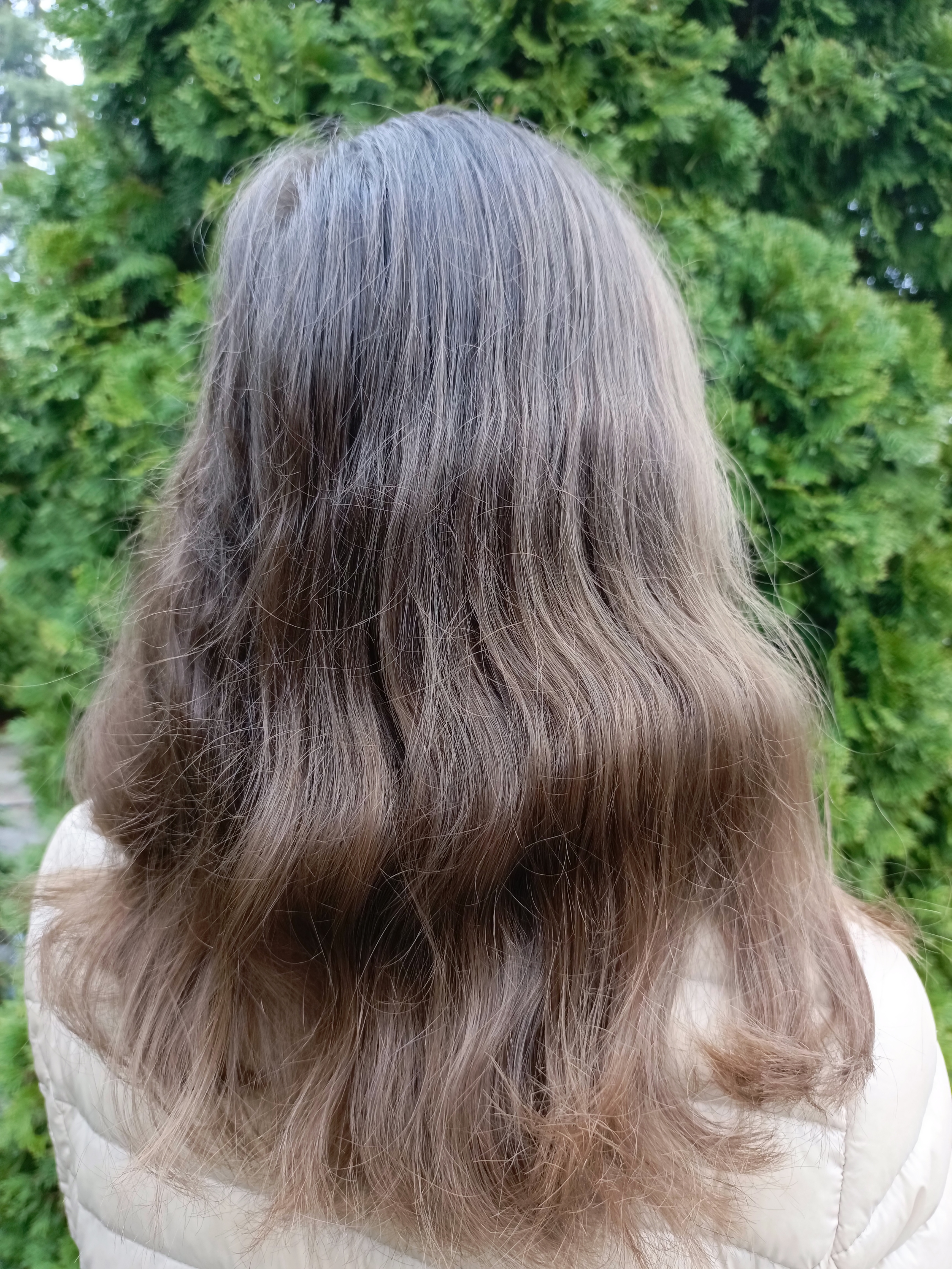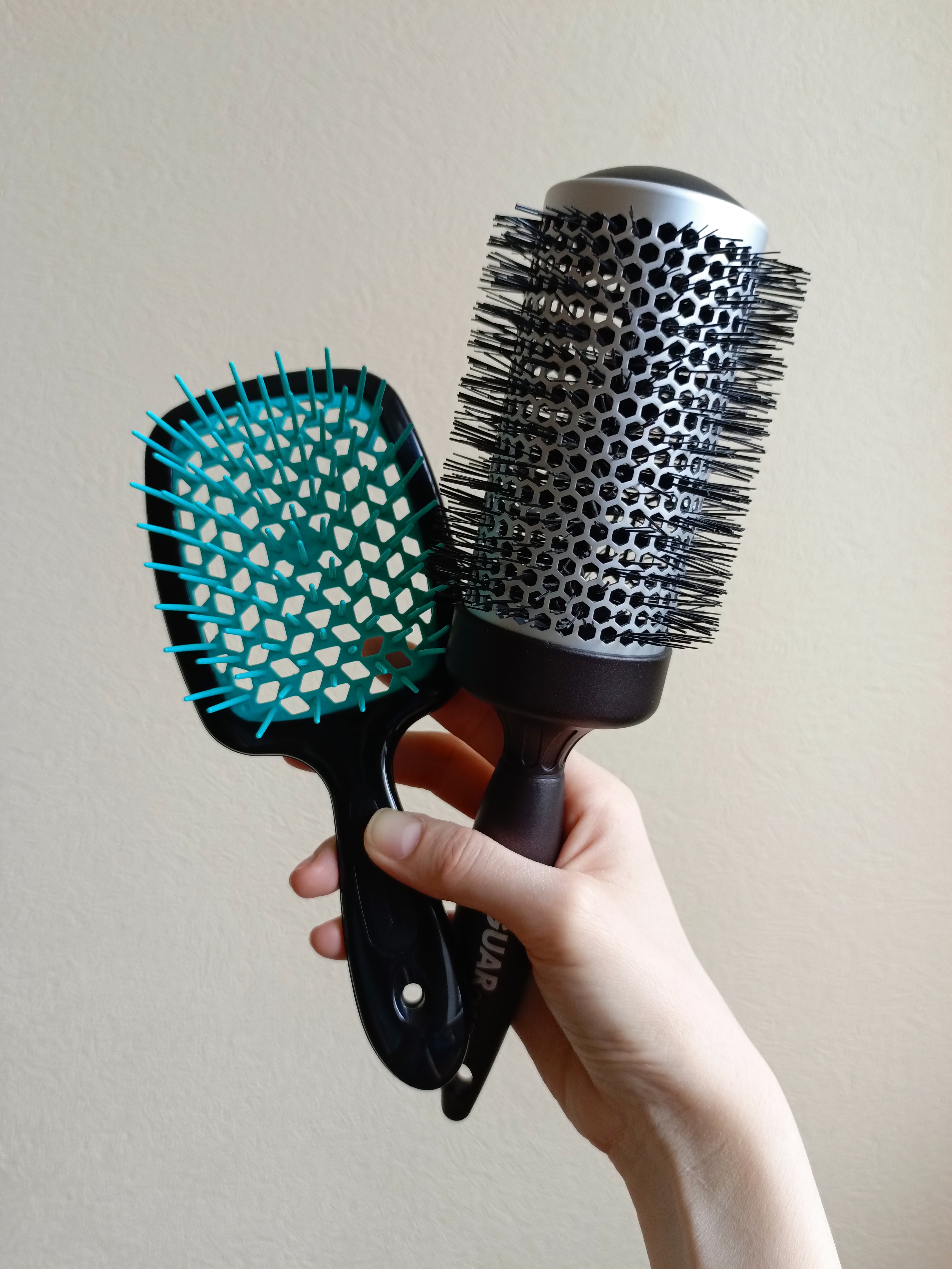 - Приступаю к укладке. Изначально пользовалась только продувной расческой: одной рукой проводила ею под прядями, а другой держала фен — так, чтобы поток воздуха шел вдоль роста волос. Результат — на втором фото. Позже взялась за у̶м̶ брашинг: прочитала, что эта техника помогает избавиться от пушистости и нежелательных завитков. Навык пока не отточен, поэтому кончики остаются волнистыми (см. третье фото).