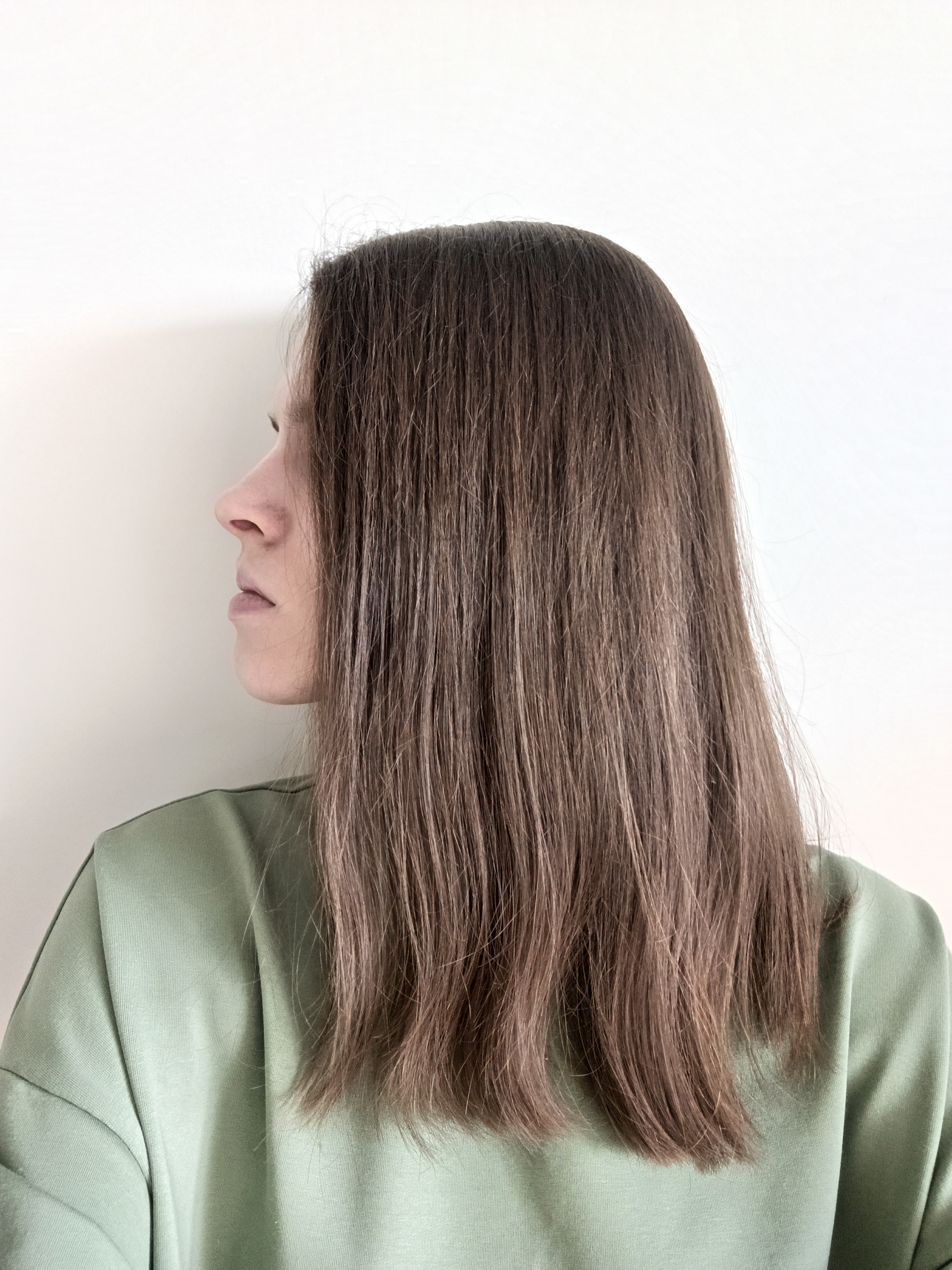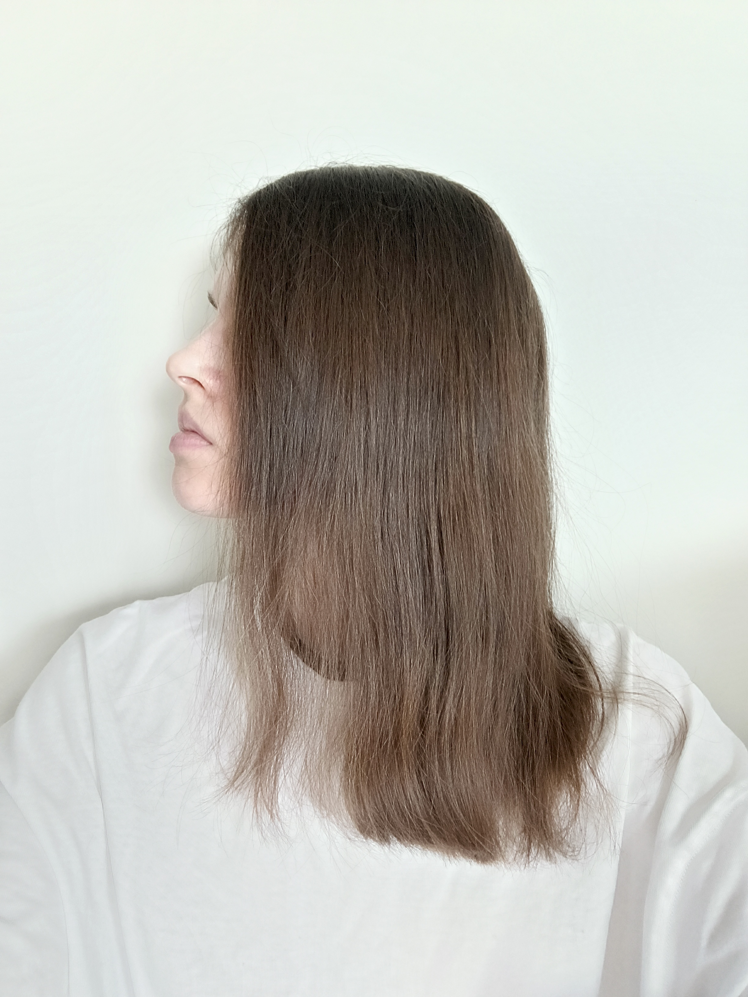 Средство визуально уплотняет волосы, и они кажутся гуще, чем есть. Фриз не исчезает полностью (сомневаюсь, что это возможно), но хотя бы перестает бросаться в глаза. Обычно я фотографируюсь перед белой дверью, на фоне которой заметен каждый волосок, выбившийся из укладки. На пятом фото видно, как моя прическа выглядит «в естественной среде».