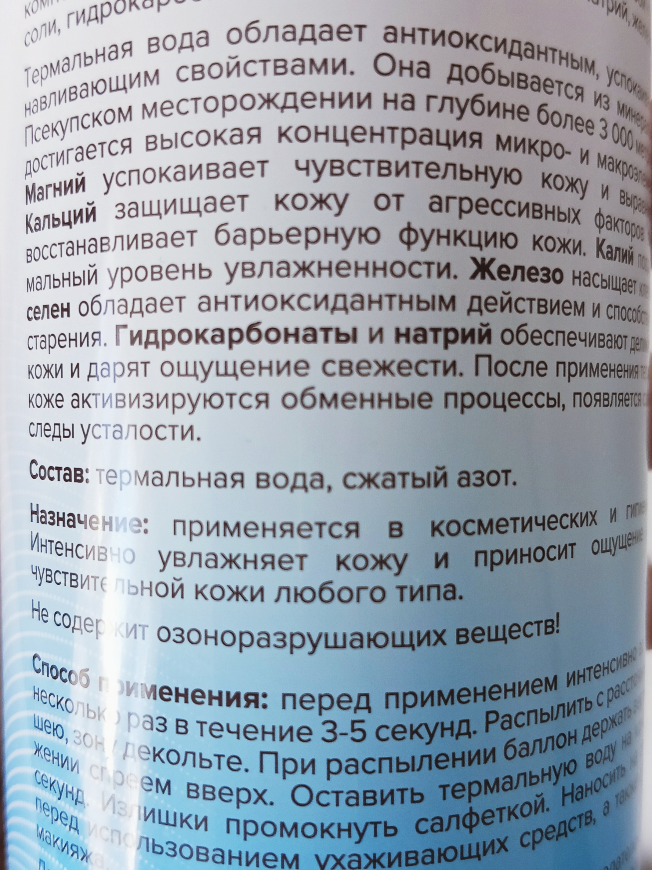 Во-третьих, никаких отдушек, сладких ароматов, которые смешиваются с парфюмом. Есть легкий немного металлический запах — как от настоящей минералки в источниках, но почти незаметный. Верится, что это не просто вода из-под крана, а с минеральными компонентами: магний, калий, железо и т.д., как обещает упаковка.