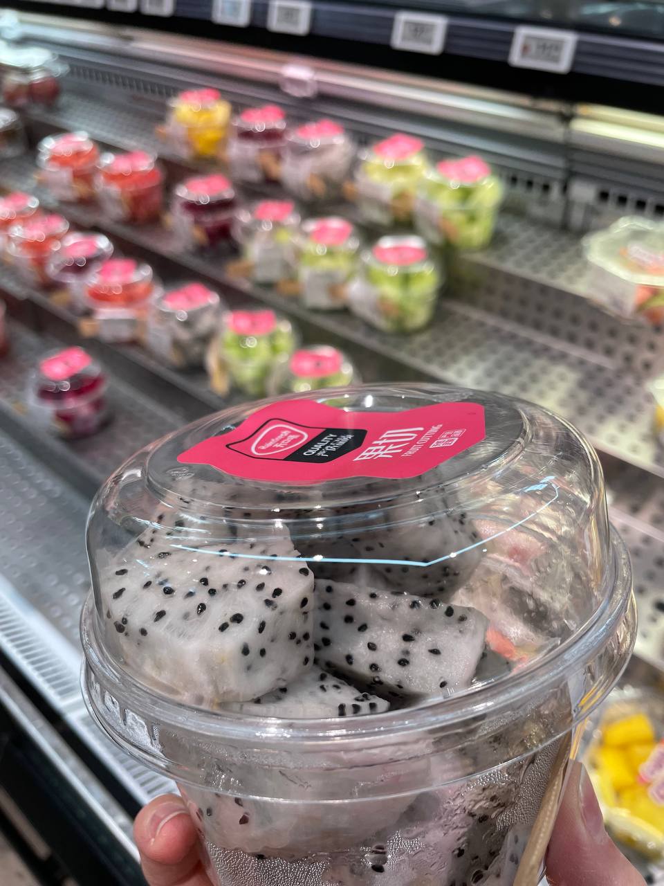 Попробовали драконий фрукт (dragon fruit). Вот такая упаковка — 13,9 ¥. Фрукт похож на киви, но почти не сладкий.