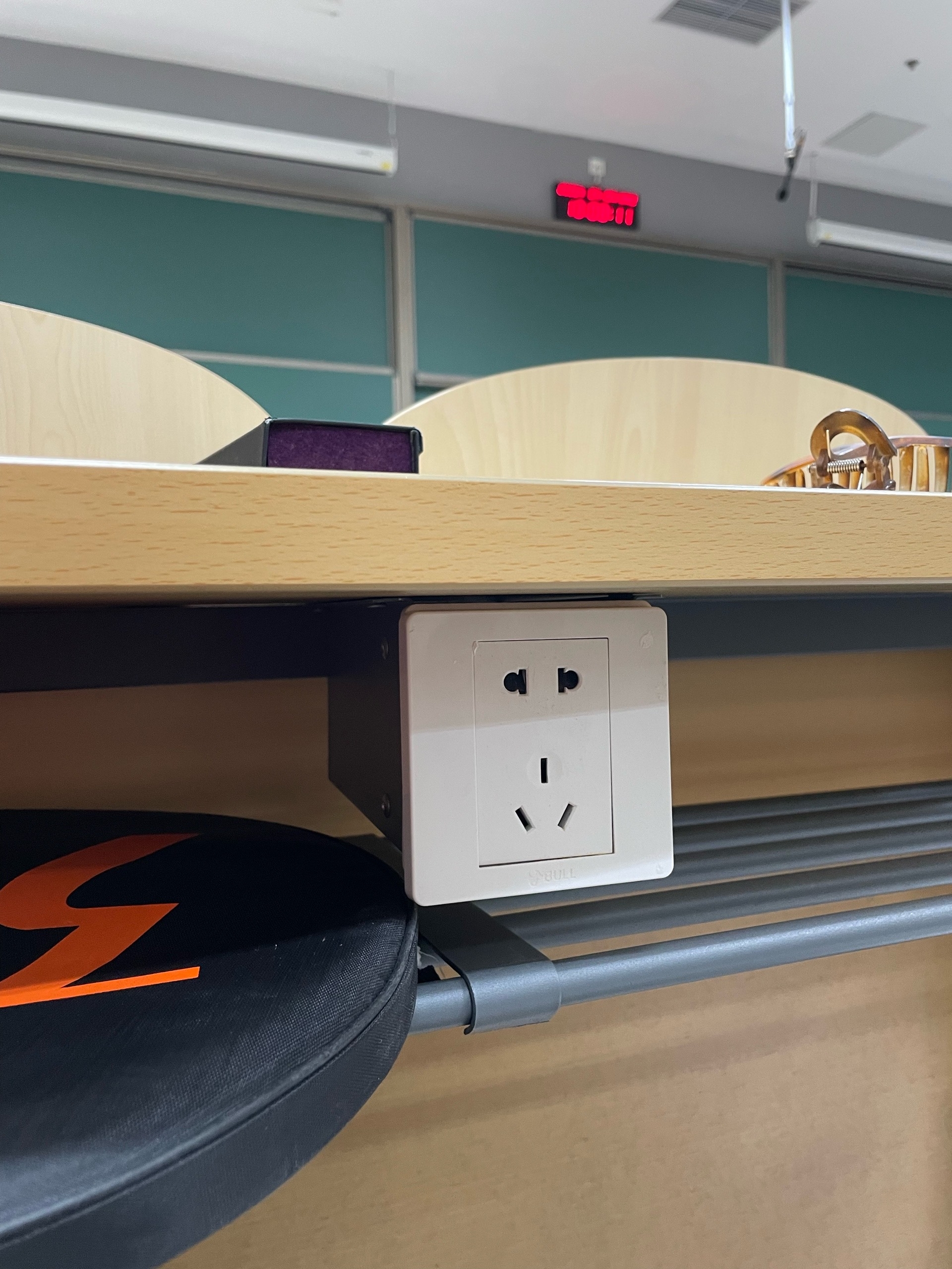 В каждой аудитории есть розетки. При чем и китайские, и европейские. То есть можно пользоваться даже без адаптера.
