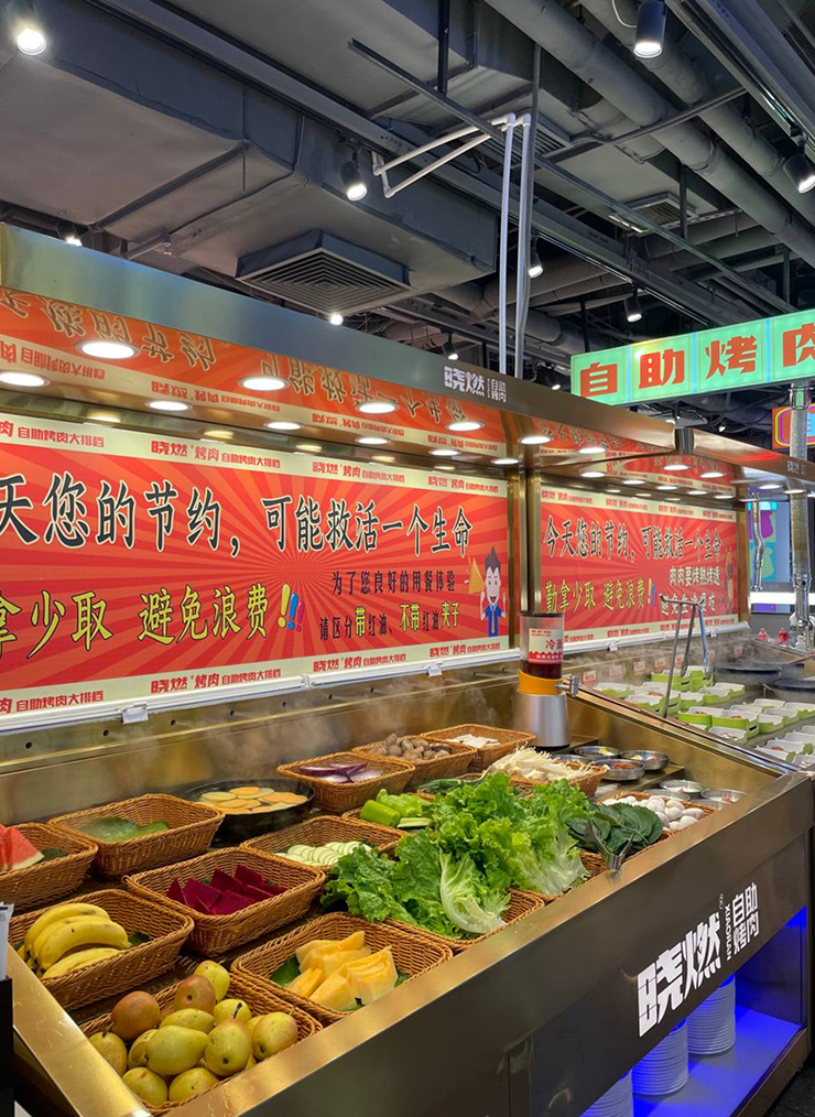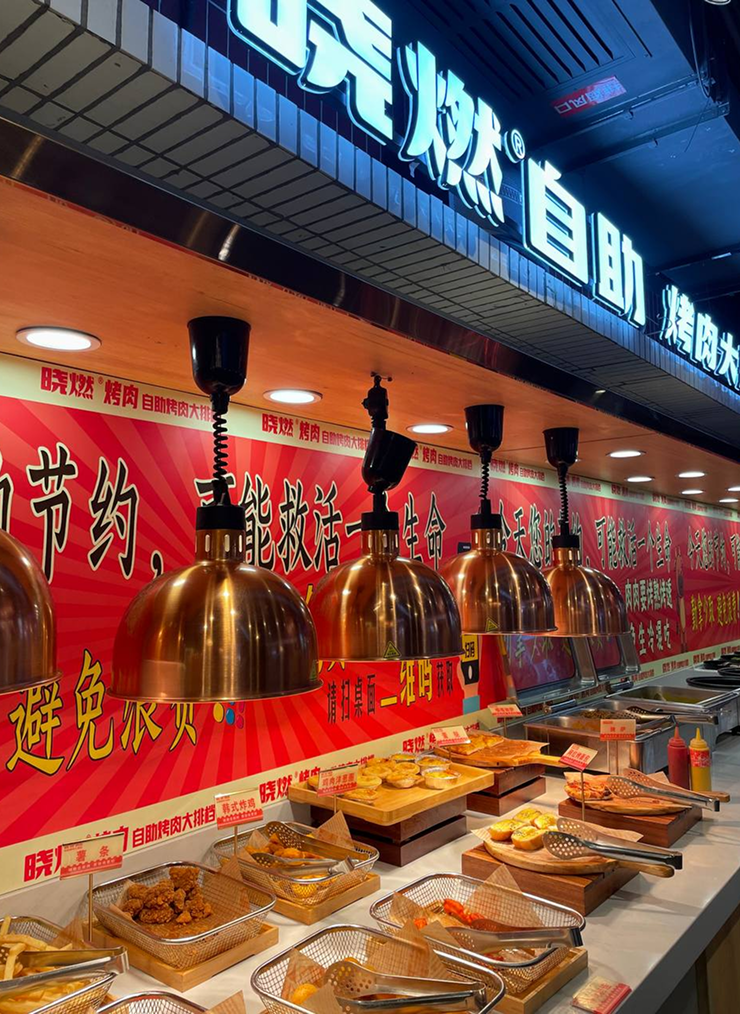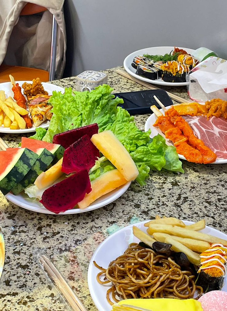 Вечером мы пошли ужинать в место, похожее на корейское барбекю. Немного напоминает шведский стол: можно брать сколько угодно мяса, фруктов, овощей и т. д., а затем обжаривать их на плите в центре стола. Стоимость входа — 79 ¥.