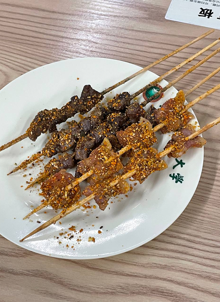 В первые дни я слышала много плохих отзывов о шашлыке. Позже попробовала сама. Например, вот такой можно взять в столовой — по 3 ¥ за палочку. Готовят при тебе.