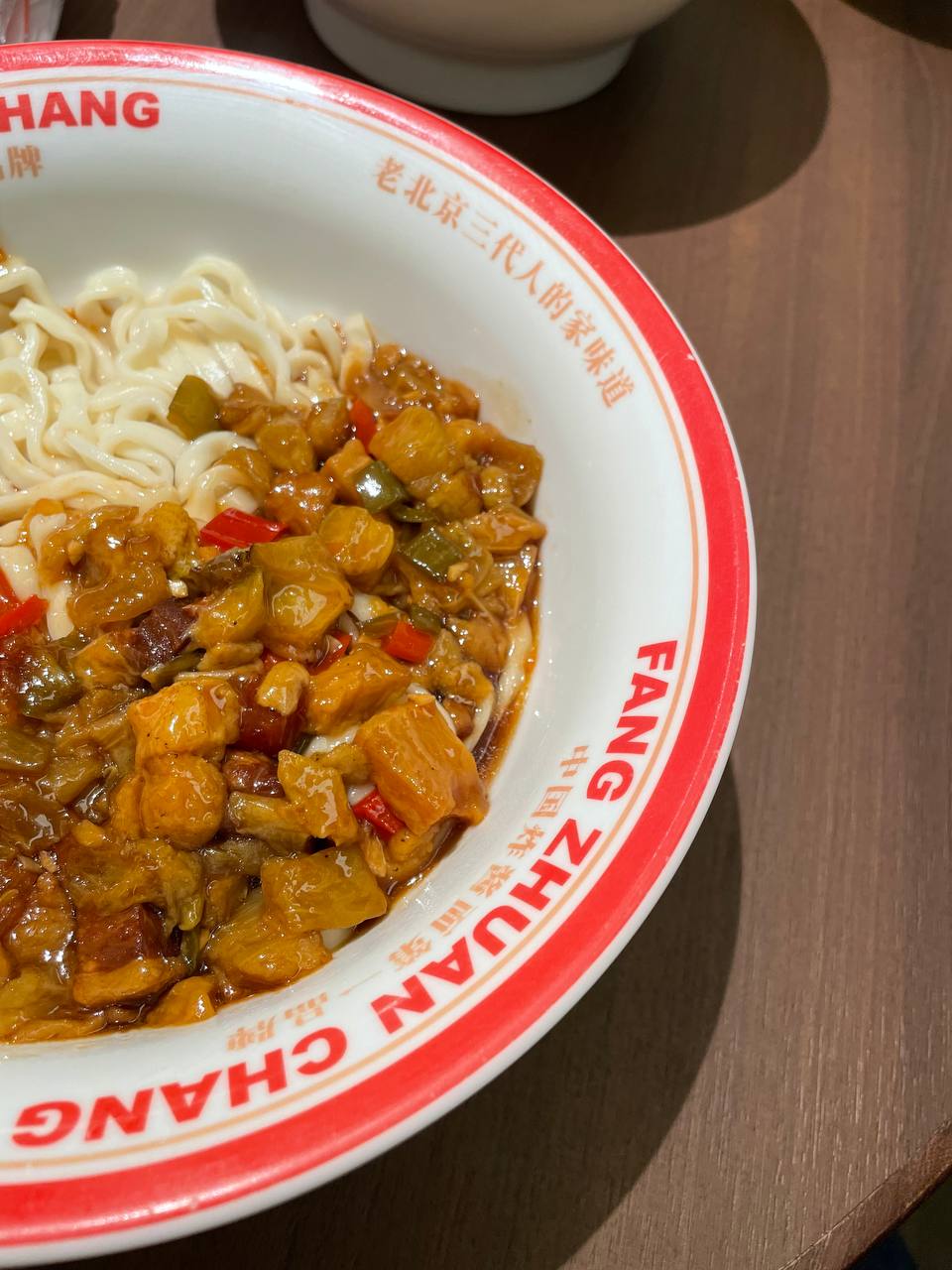 После мы пошли в торговый центр. На обед — тушёная лапша с баклажанами в соусе из свинины, 25 ¥. Очень сытно и не остро.