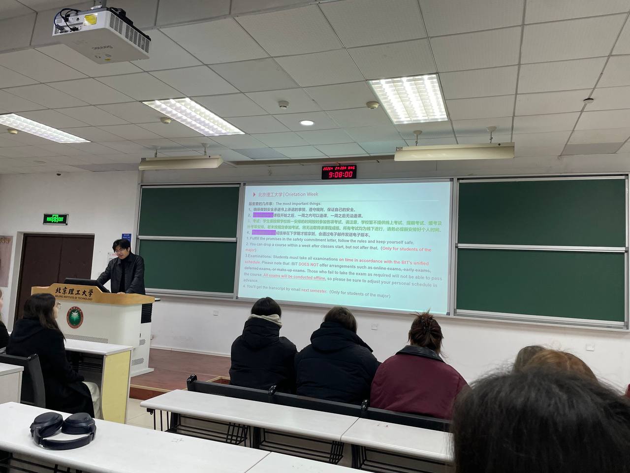 Утром нас отвезли в Liang Xiang Campus на Orientation Day. Нам рассказали о правилах поведения и о том, что делать в экстренных ситуациях. Лекцию по безопасности провёл полицейский. Кто‑то даже добавил его в друзья в WeChat.