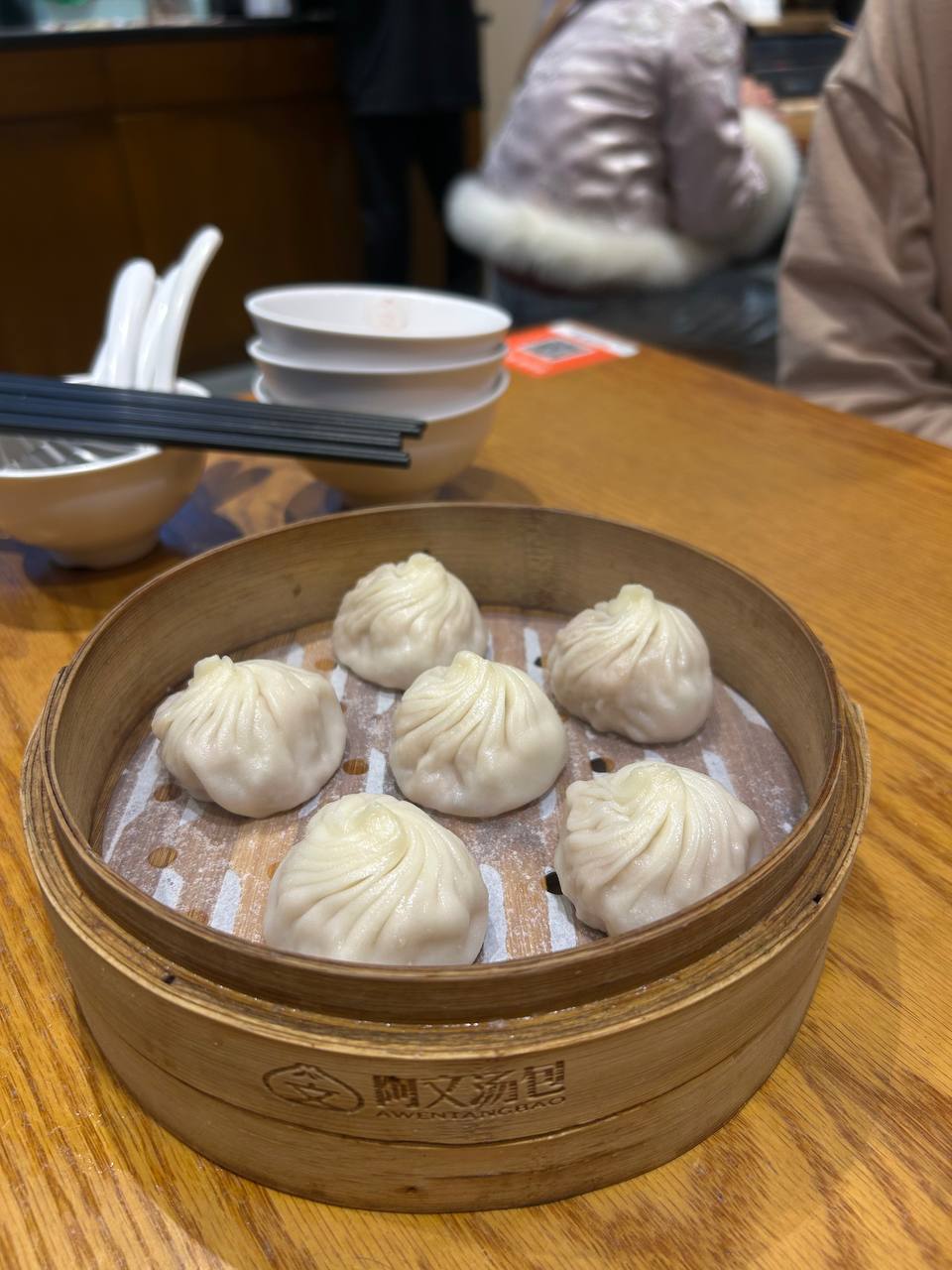 На обед дамплинги, но не как в прошлый раз. Эти похожи на пельмени, которые ел По в «Кунг‑фу Панде». 6 штук со свининой — 26 ¥. На вкус очень сладко. Возможно, мясо было соевым.