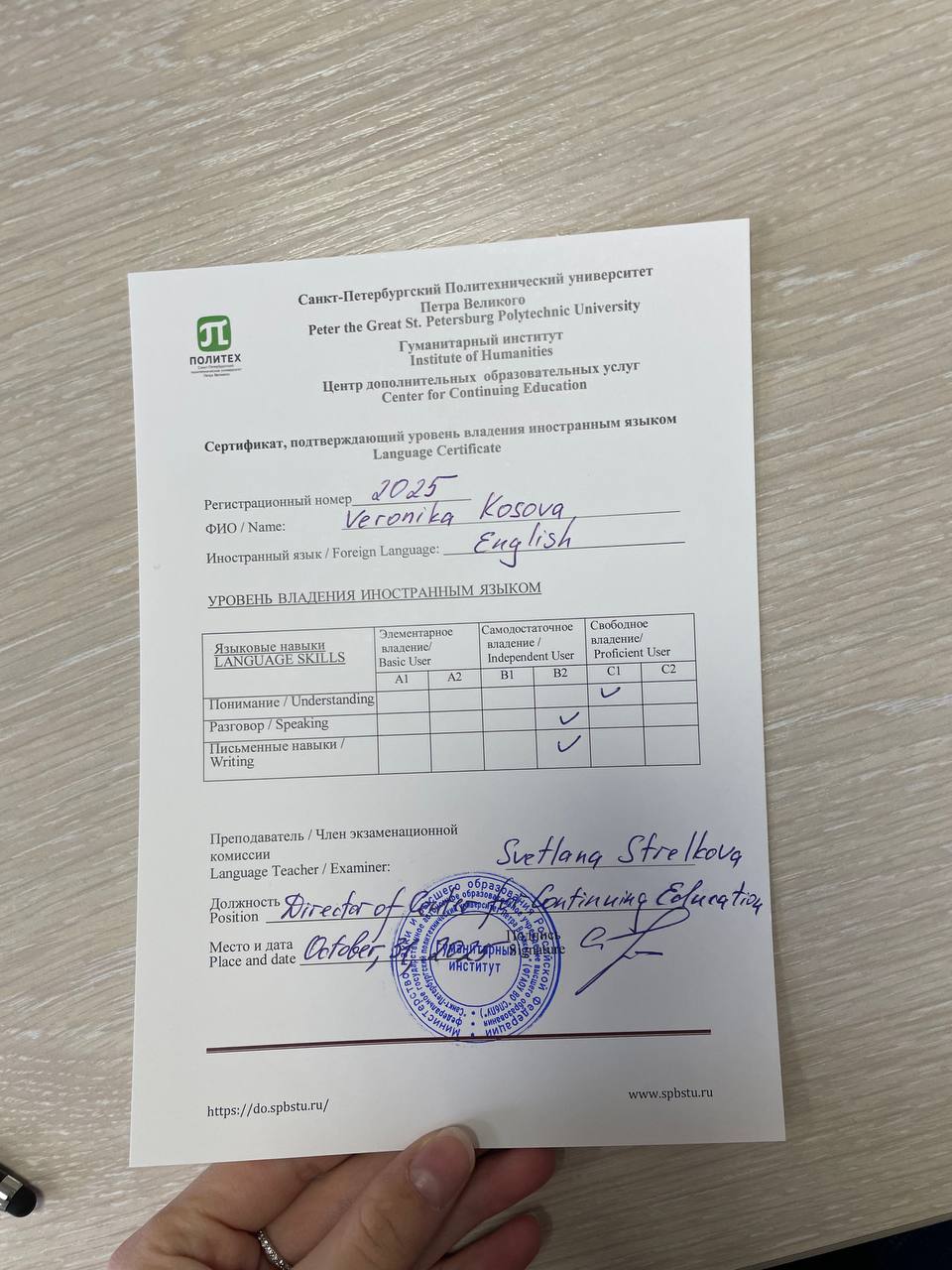 Языковой сертификат. Я сдавала экзамен в Лингвистическом центре при СПбПУ. Стоимость — 2 000 ₽. Это было несложно. Экзамен состоял из теста с вариантами ответов, письменного задания (письмо или эссе) и устного собеседования. Сертификат выдали в тот же день.