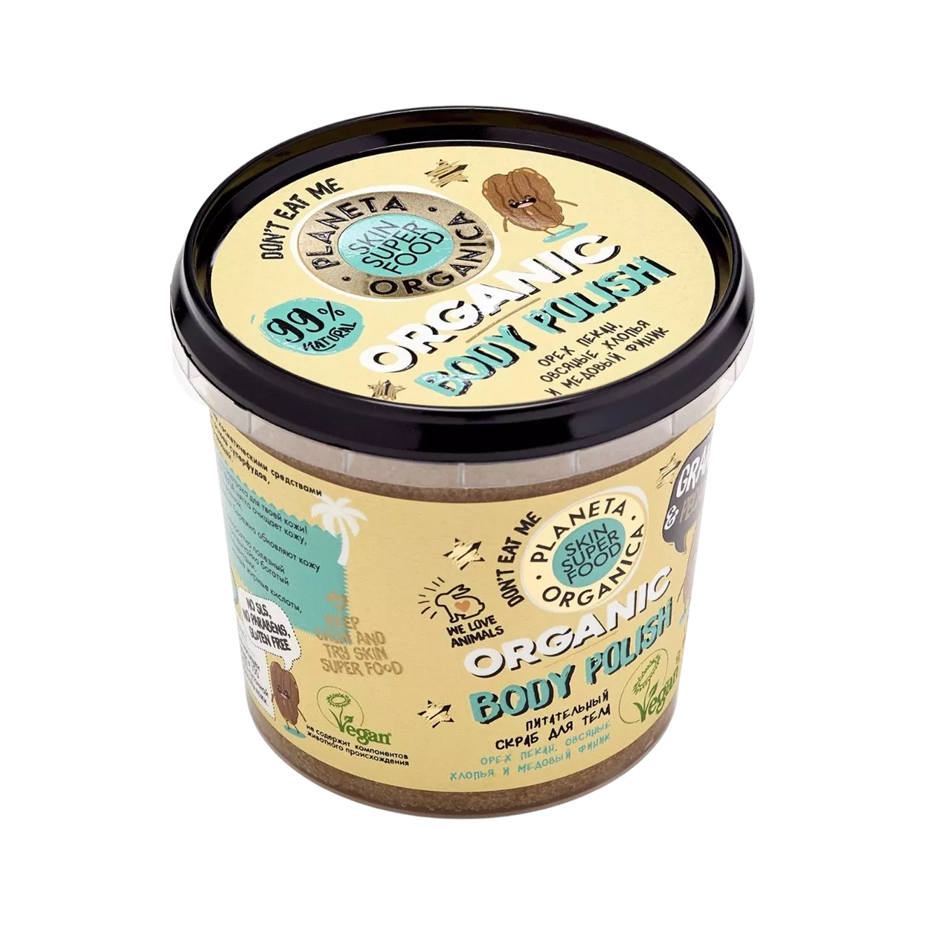 Популярный скраб с отличным соотношением цены, качества и объема. За небольшие деньги вы получаете почти пол-литра продукта с мощным набором абразивов: соль, сахар, овсяные хлопья и кедровая скорлупа. Все это — на питательной масляной основе, которая не оставляет жирного слоя. Такое комбо оценит нормальная и сухая кожа: для тонкой и чувствительной здесь слишком серьезные абразивы. Еще один минус: высокий риск аллергии из-за меда в составе.