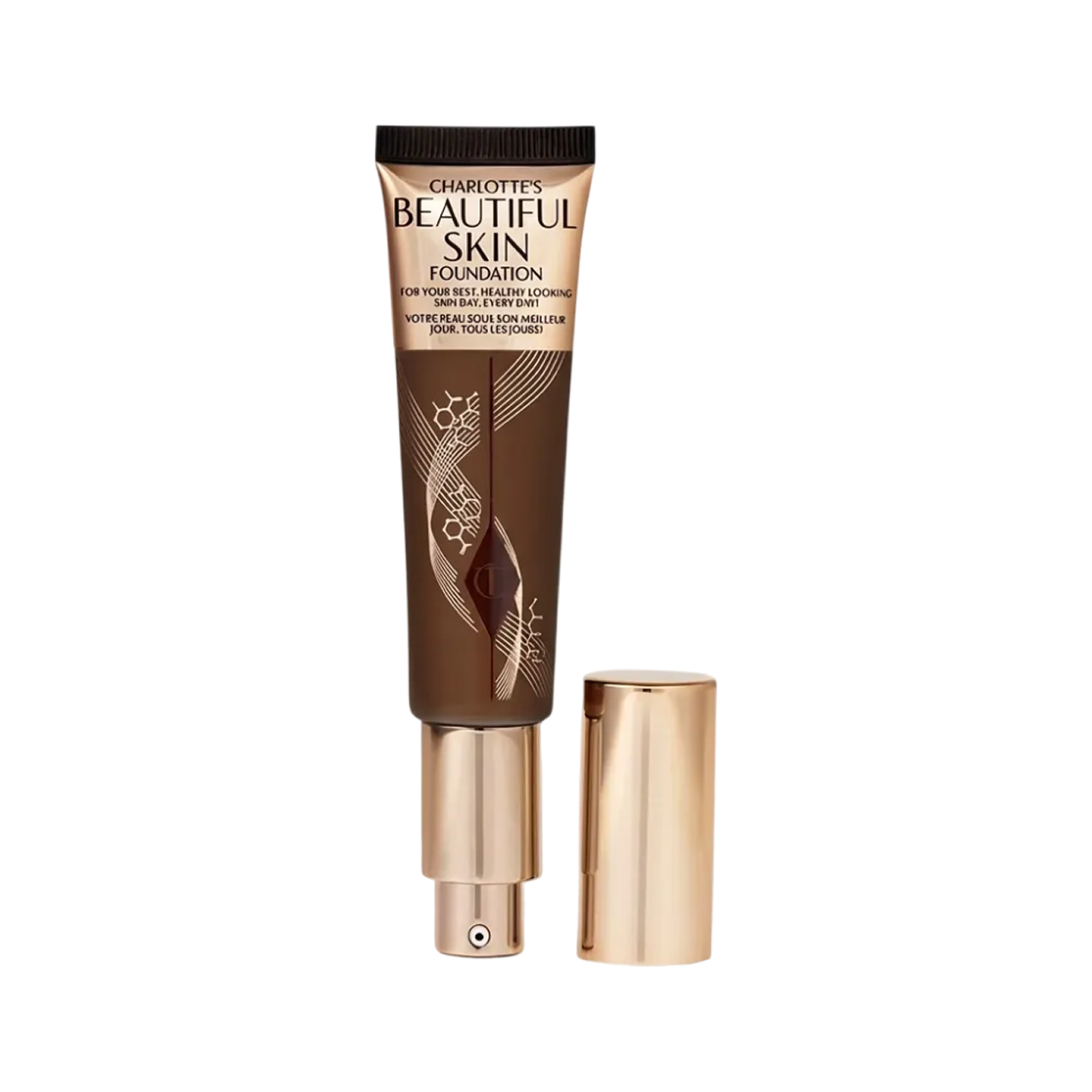 Тональные основы Charlotte Tilbury стали культовыми, потому что дают эффект холеной кожи — с легким сиянием без глухого матового финиша. Это увлажняющий тональный крем с гиалуроновой кислотой, экстрактами розы и кокоса. Формула дополнена запатентованным комплексом Bix’Activ для визуального сглаживания пор. Палитра очень разнообразная, в ней 30 оттенков
