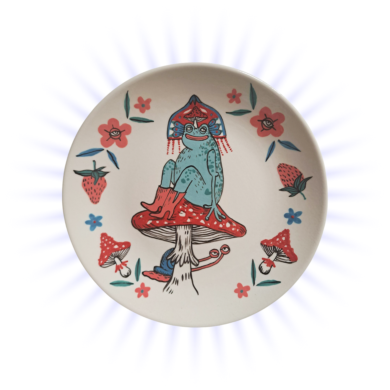 Все изделия петербургской марки керамики отсылают к русским народным сказкам: миска стоит на курьей ножке, у светильника три драконьи головы, а на тарелке красуется царевна-лягушка — до чудесного превращения