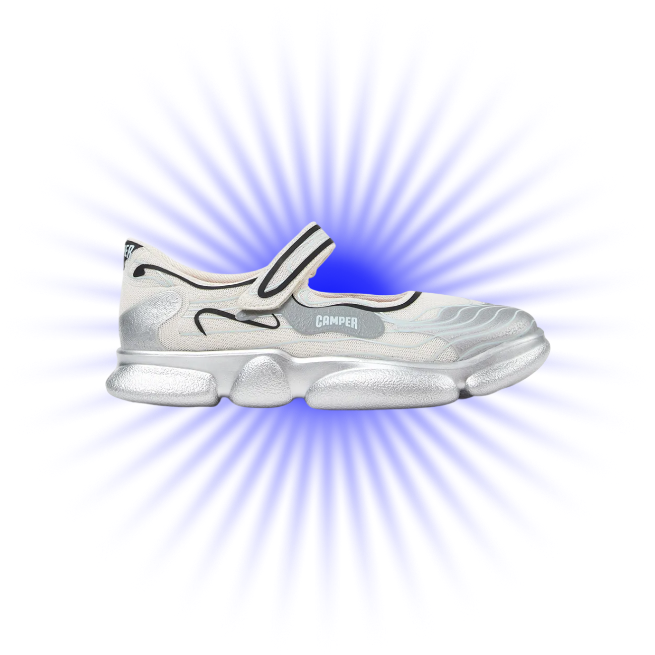 Модель вышла в рамках лимитированной «серебряной» коллекции, приуроченной к 50-летнему юбилею Camper. Балетки выполнены из экологичного переработанного полиэстера, имеют дышащую стельку с антибактериальной пропиткой и массивную, но легкую подошву из инновационного материала XL Extralight®, обеспечивающего хорошую амортизацию. Дизайн пары навеян ландшафтом горной цепи Сьерра-де-Трамонтана