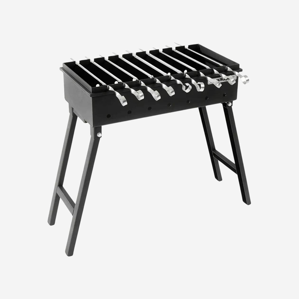 Несмотря на скромные размеры, мангал Gourmet Meat мало чем уступает более габаритным моделям, а по некоторым параметрам даже выигрывает. Правда, готовить придется низко: размер чаши — 38 × 27 × 16 см, высота с ножками — 38 см. Если это не смущает, можно рассмотреть этот вариант.