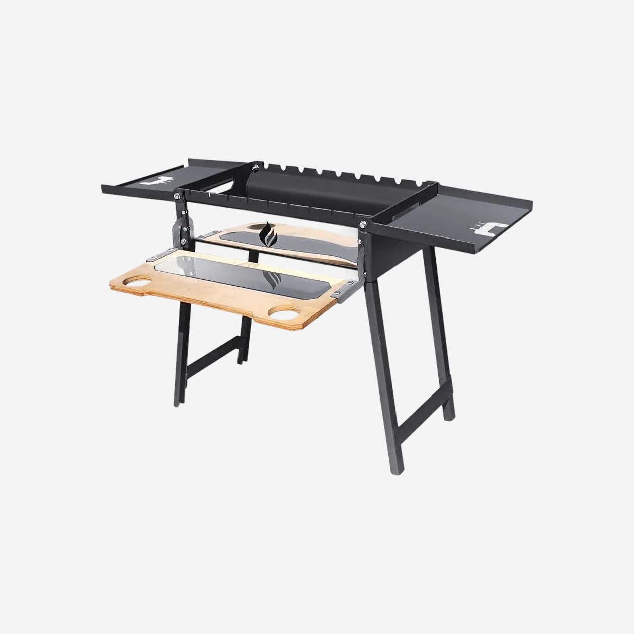 Конструкцией предусмотрены боковые полки, их можно использовать как рабочую поверхность, а в сложенном виде — как крышку. В комплекте также есть съемная полка-столик из дерева с металлической вставкой и подстаканниками, пять шампуров и перчатки.