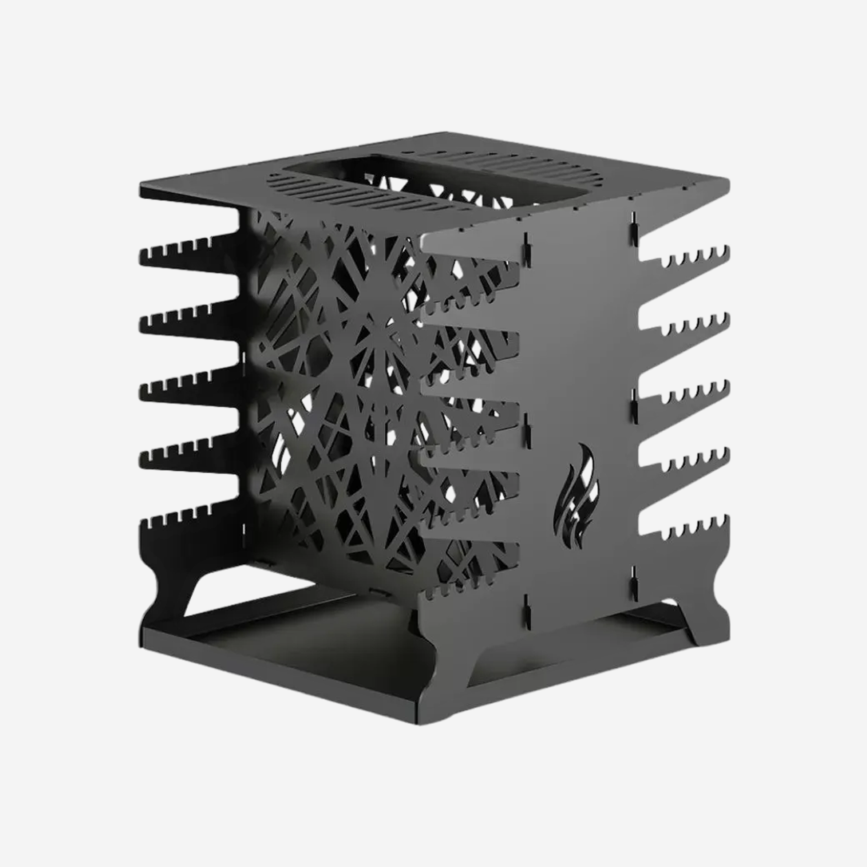 Также предусмотрены ручки, отверстия для доступа воздуха и выдвижное дно. В комплекте — сумка и веер. Кроме того, к мангалу прилагается дополнительная накладная секция с подказанником.