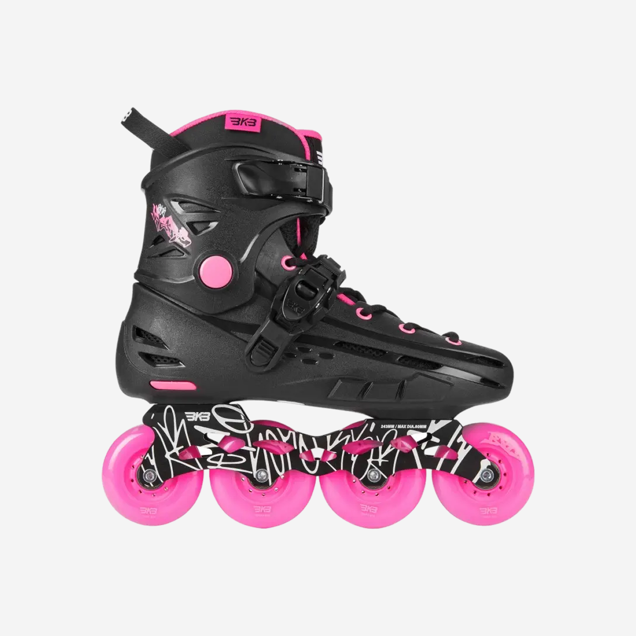 Ботинок фиксируется на ноге верхней и пяточной баклями с подкачкой и шнуровкой — лучшая комбинация. Сбоку сменные накладки — слайдеры, которые принимают на себя основной удар при падении и уберегают ботинок от стирания об асфальт. Это продлевает роликам жизнь.