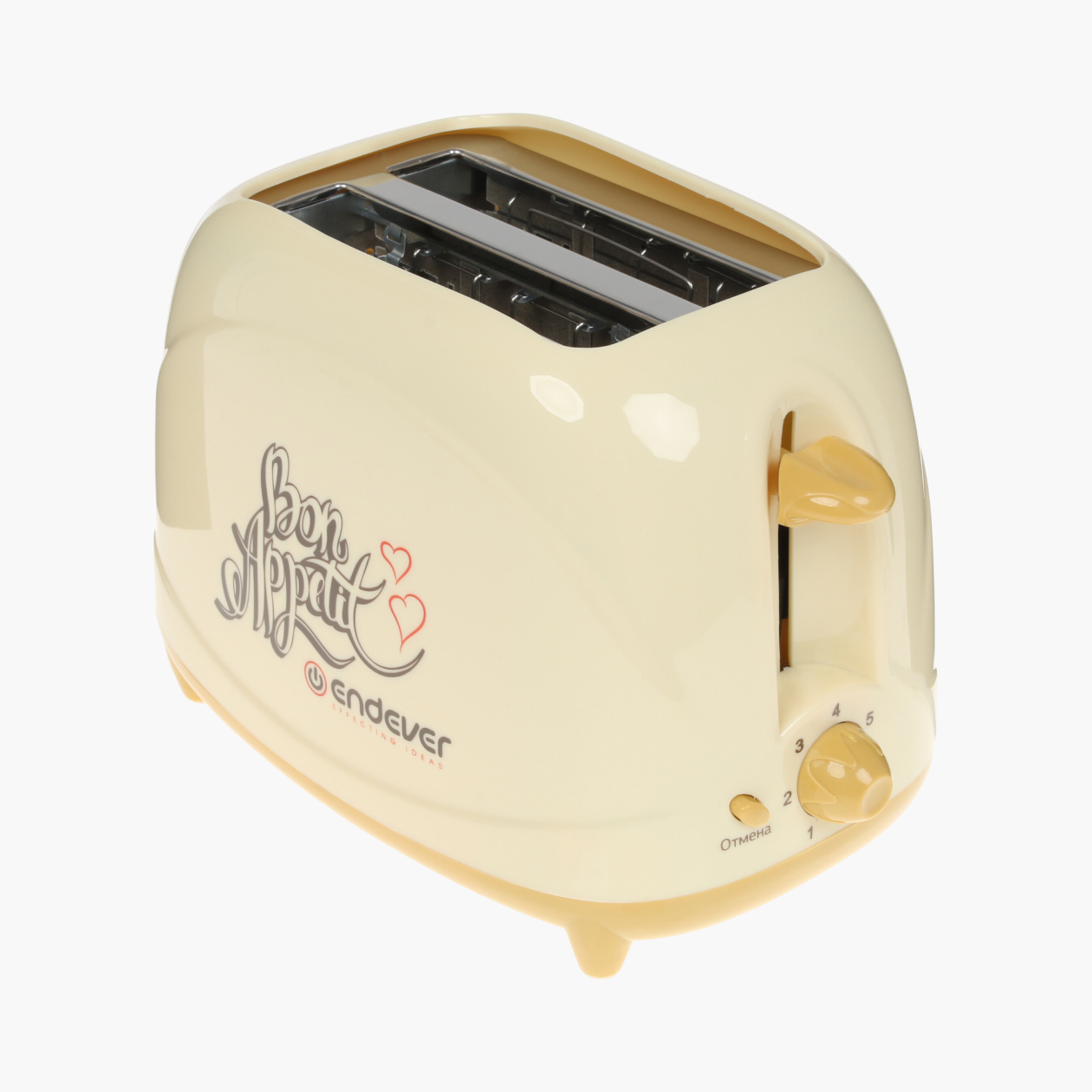 В комплекте съемный трафарет с сердечками, он оставляет рисунок на хлебе и особенно нравится детям. В линейке есть модели с другими трафаретами — солнца или чашки кофе.