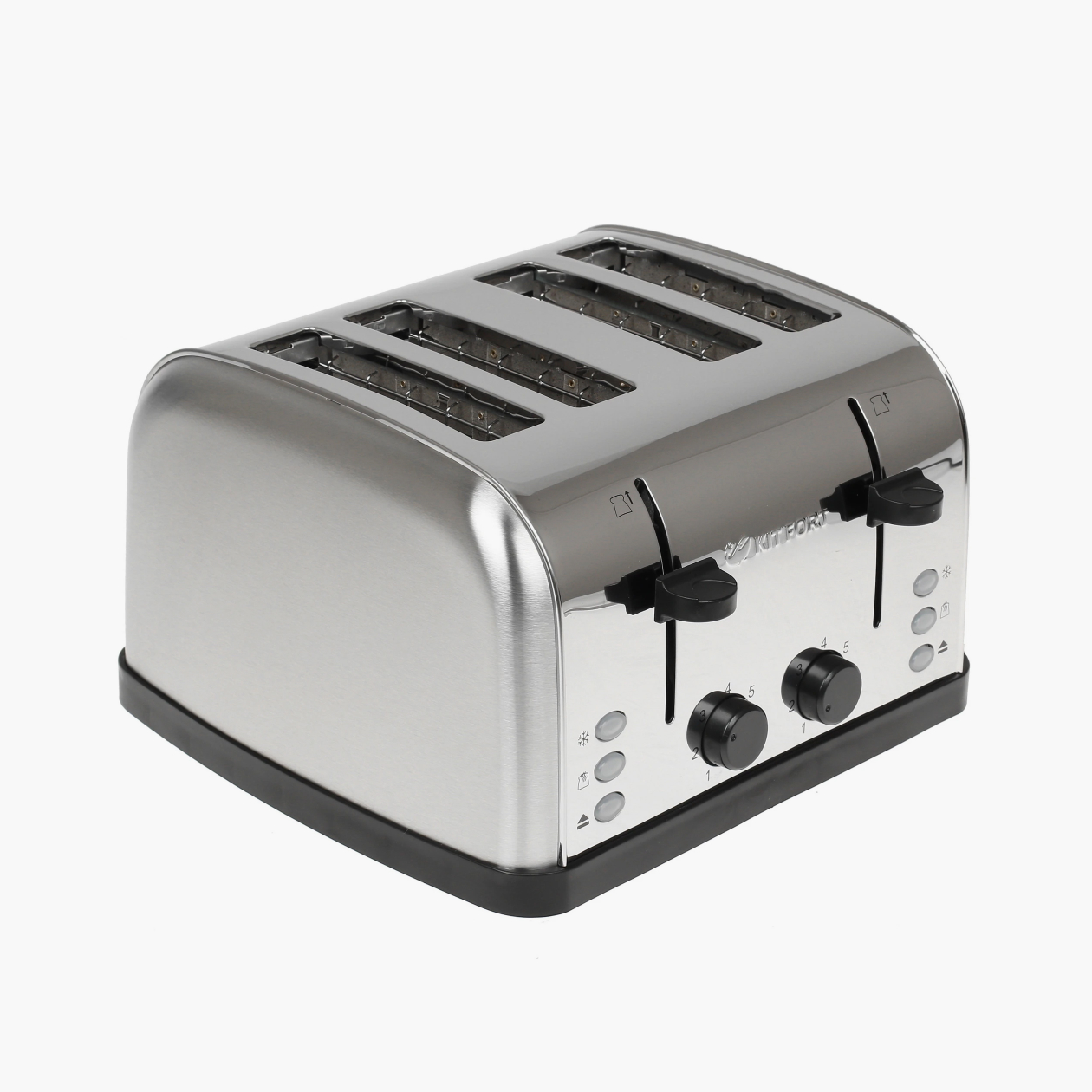 Управление механическое: у каждой пары слотов свой регулятор прожарки, экстраподъем и отдельные кнопки для подогрева, разморозки и остановки цикла. Это удобно, если члены семьи любят разную степень подрумянивания: можно одновременно готовить два тоста слегка подсушенными и два — с хрустящей корочкой.