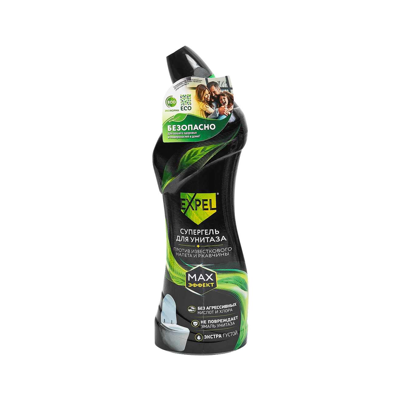 Этот гель на основе щавелевой и лимонной кислот предназначен для борьбы с мочевым камнем, биологическими загрязнениями, ржавчиной и налетом. Expel отлично справляется со свежими отложениями и подходит для регулярной уборки. Но въевшуюся желтизну может убрать после нескольких применений, причем стенки нужно будет активно чистить щеткой или ершиком. Гель безопасен для септиков и не имеет отдушки