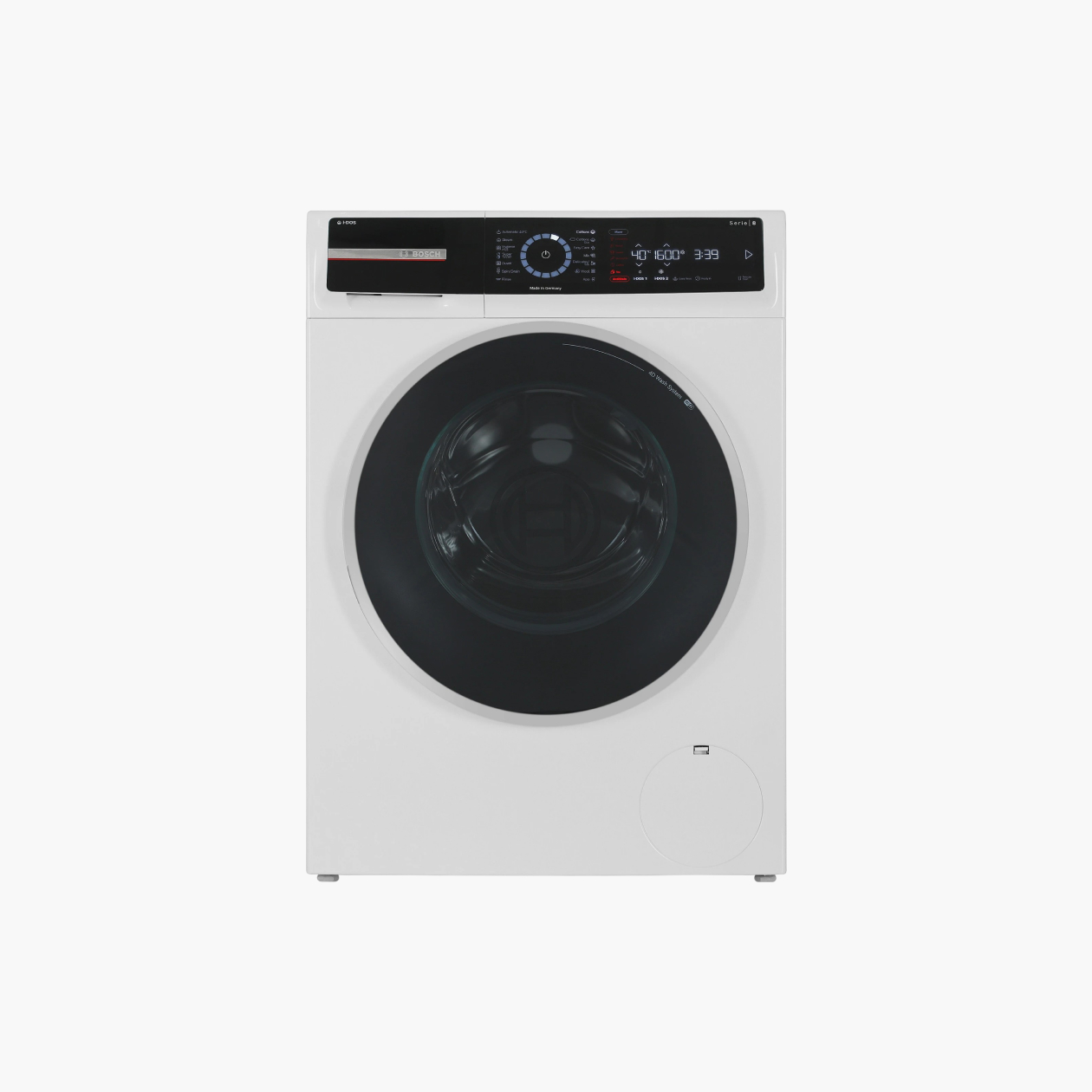 Полноразмерная отдельностоящая машина немецкого производства с автопрограммой стирки, автодозированием моющего средства и подсветкой барабана. Глубина — 59 см. Относится к серии 8.
