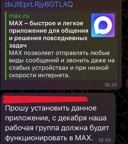 Так это о чем. Я работаю в государственном бюджетном учреждении здравоохранении. Думаю, не столько важно, в каком, поскольку эту коснется или уже касается всех. Прилетает вчера смска в Telegram от старшей м/с с содержанием характера, мол, надо скачать «макс», чтобы мы там состояли в рабочем чате. Это вполне себе на уровне «национального мессенджера "Max"».