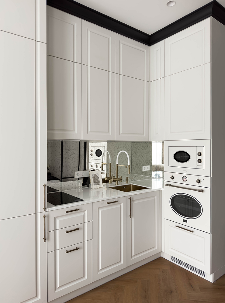Это компактная студия в ЖК My Priority Basmanny площадью 34 м² и с потолками 3 м. Их высота во многом определила выбор стиля, но в помещении с более низкими потолками тоже можно повторить что-то подобное. Над проектом работали дизайнеры Уланова Евгения и Юнна Лукинских, автор канала «Yuloo Studio — Инвестдизайн», фотограф — Юлия Снарова.