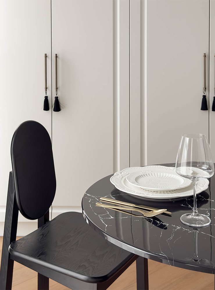 Фактурные детали. Чем интереснее и сложнее мелочи в черно-белом интерьере, тем более индивидуальным и наполненным он будет казаться. Подойдут фактурная посуда вместо обычной белой и гладкой, необычные светильники, кисти на ручках мебели, принты с одним из оттенков.
