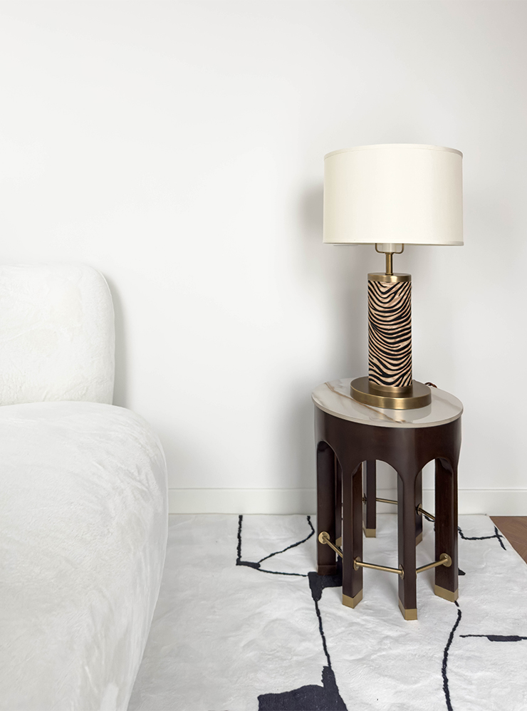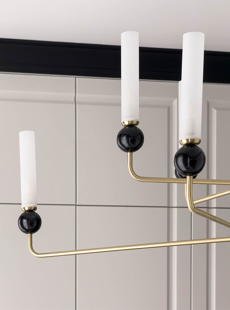 - В монохромную палитру можно добавить деталей, например необычную люстру или сложный принт. Из таких мелочей складывается атмосфера стиля.