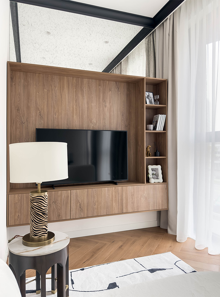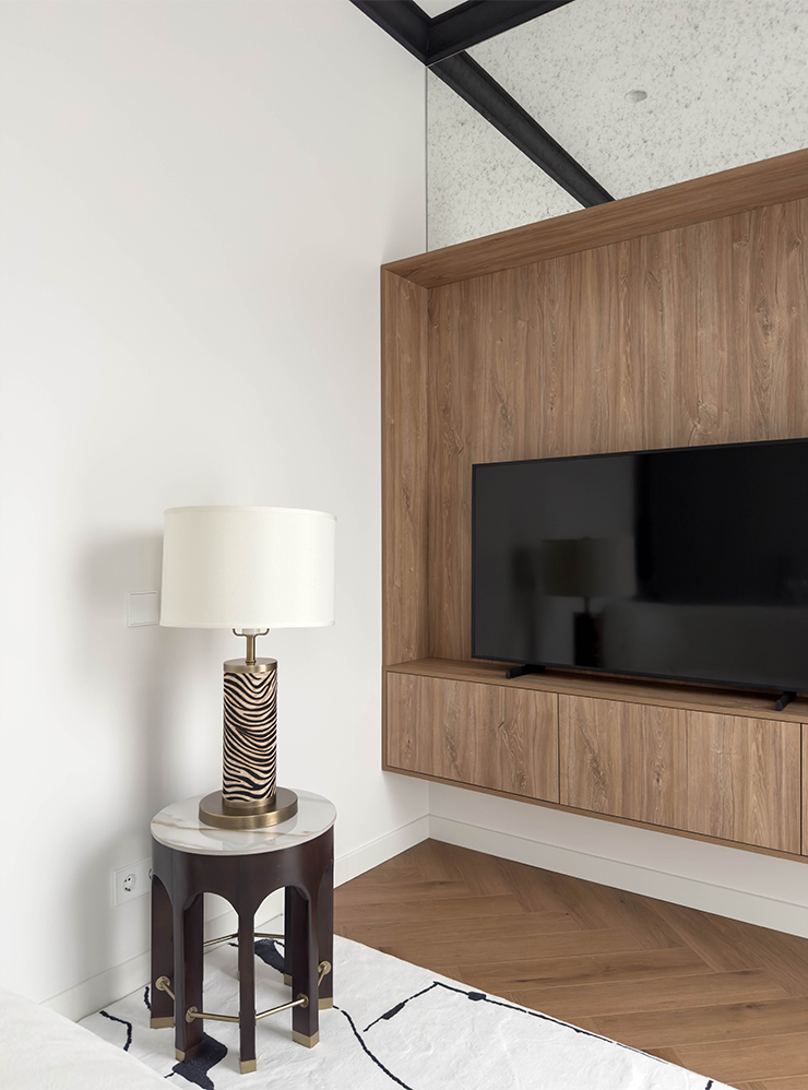 Разбавлять третьим цветом. Если в черно-белый интерьер хотят добавить большой черный объект, например телевизор, снизить высокую контрастность поможет третий цвет. Часто его еще делают фактурным: добавляют узор или выбирают природный материал — дерево или камень.